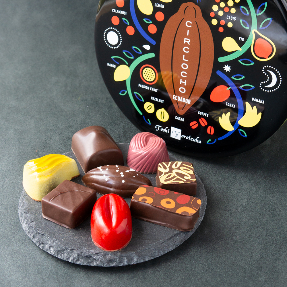 Circlocho(シルクロッチョ)とはエクアドルの言葉(スペイン語)でCircio(丸・円)、Ocho(8)を掛け合わせた造語です。丸い缶に8粒のショコラというだけでなく、日本では縁起の良い数字でもありますので日本もエクアドルもおいしいショコラで末広がりに円やかのという気持ちでつけました。Ecuador Yoroizuka Cacao Farmのカカオをメインに使用し、Ecuadorにちなんだ素材を世界各地から厳選し、渾身の技術と愛情でマリアージュさせたCirclocho8粒をぜひご堪能ください。
