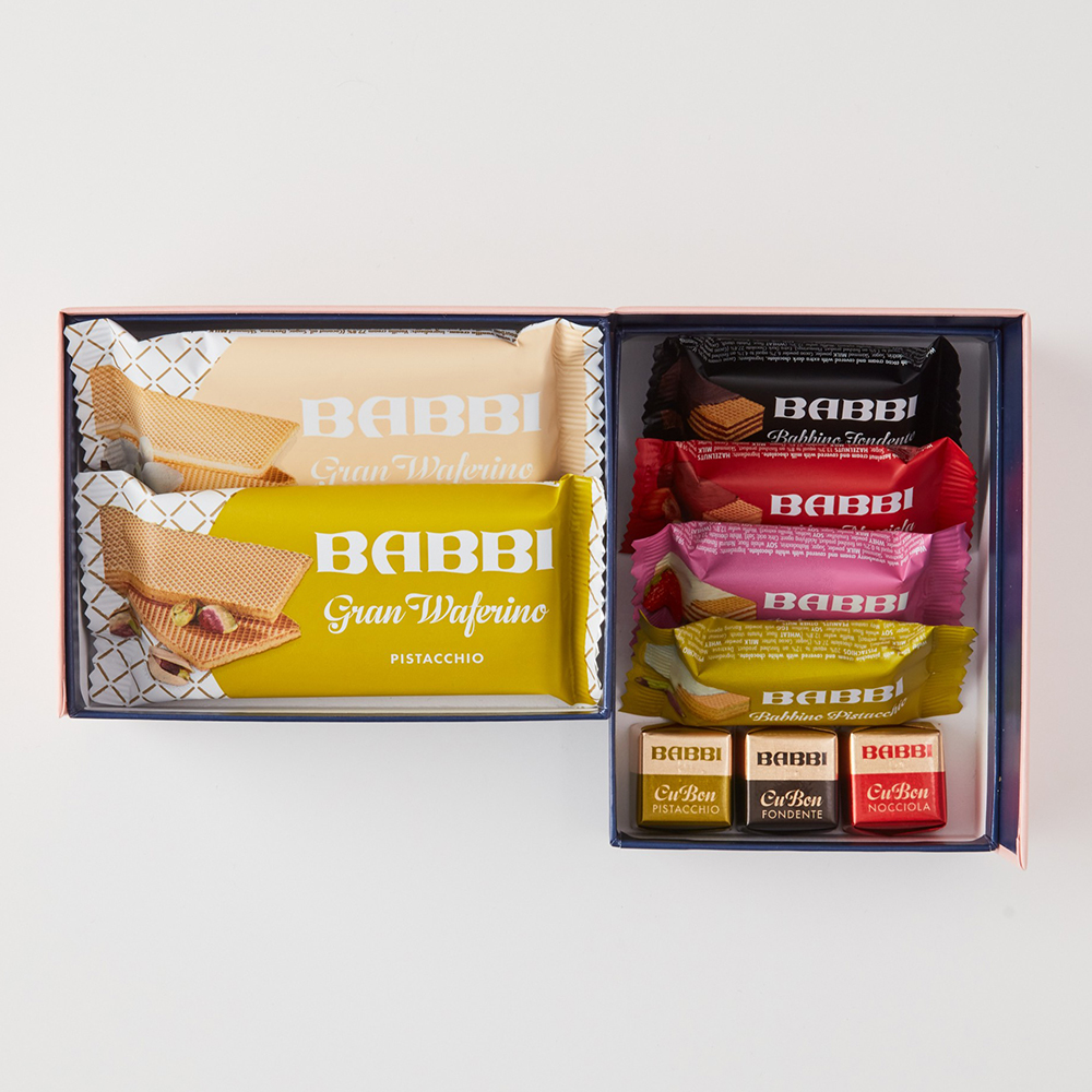9種のドルチェが楽しめるアソートボックス。定番ウエハース『グランワッフェリーニ』に加え、季節限定チョコレートウエハース『バッビーノ』、クリームをチョコレートで包んだ『クボーン』を詰め合わせました。どれから味わうか迷う楽しさも詰まった、ひと箱で楽しむドルチェの宝石箱です。