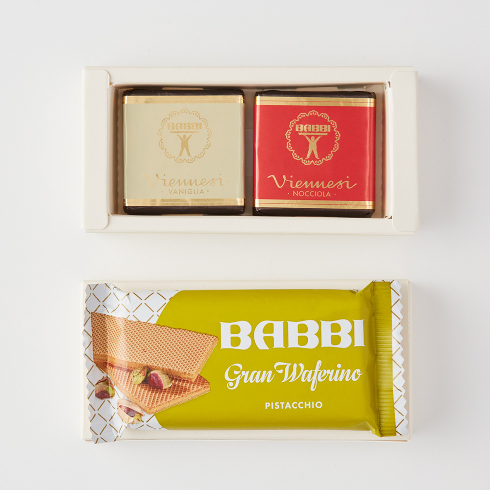初めてBABBIを味わう方にぴったり。軽やかなくちどけのウエハース「ワッフェリーニ」と、季節限定チョコレートウエハース「ヴィエネッズィ」のバニラ・ヘーゼルナッツを詰め合わせました。ひと口ごとに広がるイタリアの伝統の味わいを、ぜひご堪能ください。