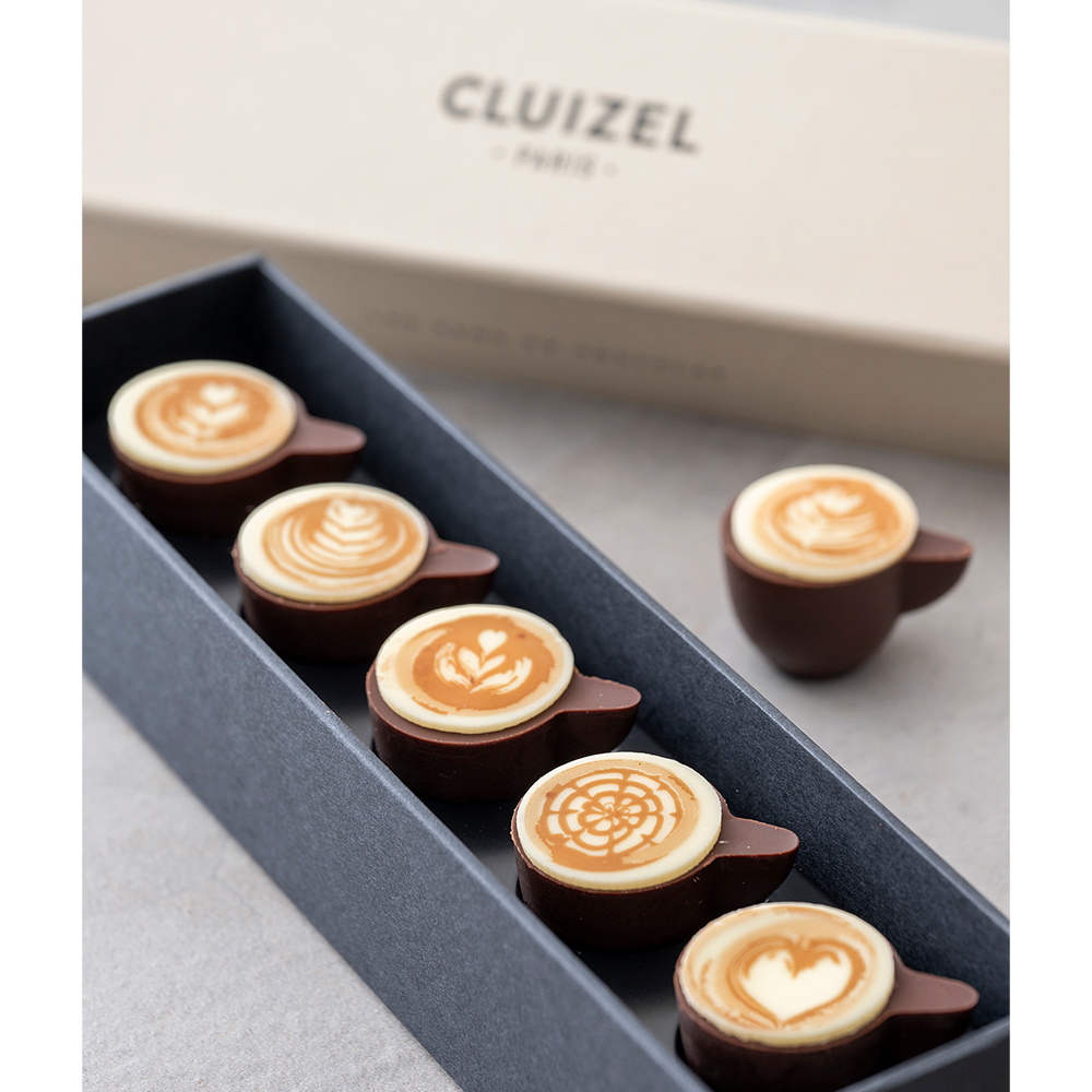 ダークチョコレートのカップに、本物のコーヒー豆を加えたミルクチョコレートのガナッシュ。カプチーノに見立てたユニークなデザインのチョコレートです。