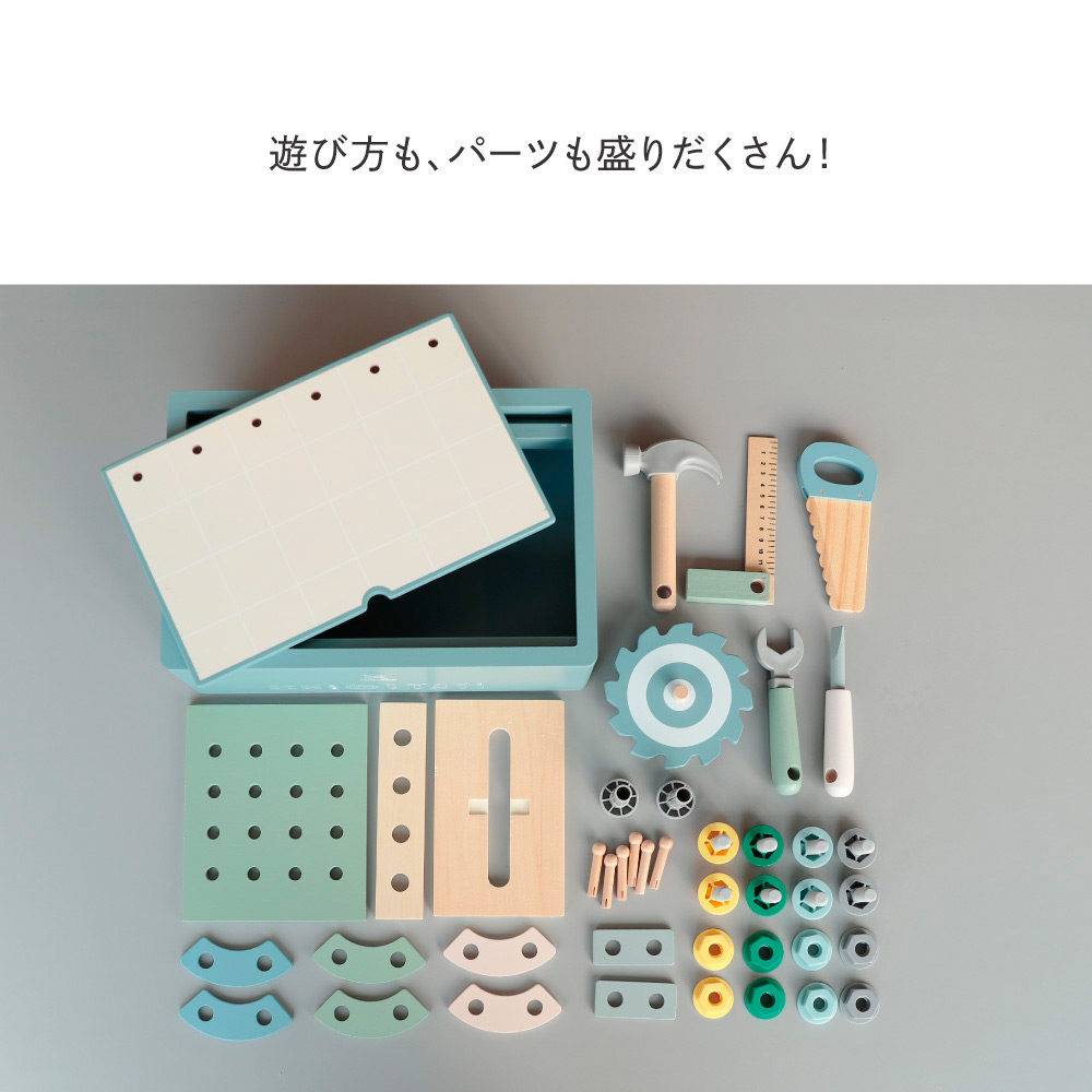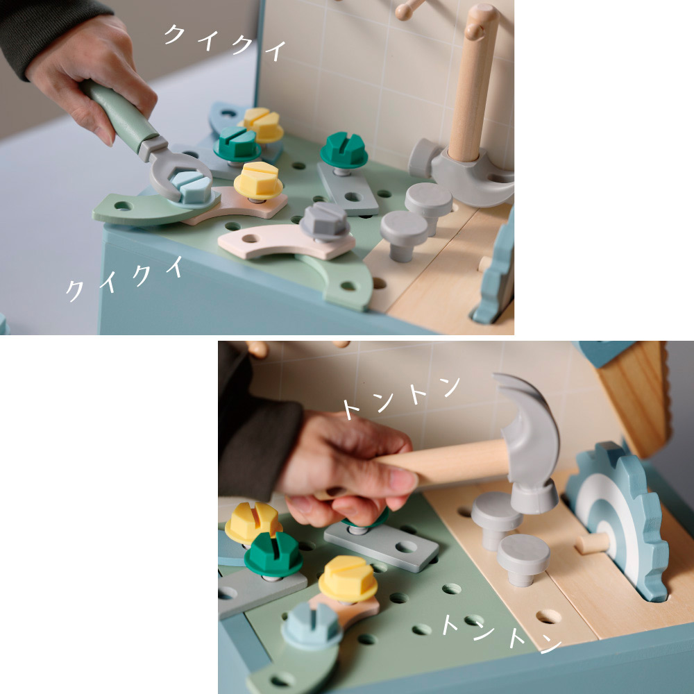インテリア・雑貨を扱う堺市の<magnet>からかわいいパッケージが特徴の<アドニルランド>の玩具。本物みたいな工具を使ってネジをキュッと締めたり、丸ノコをくるくる回し、工具の使い方を学びながら手先の器用さや想像力を育むおもちゃ。大人のまねっこをしながら、手先の器用さや創造力を育むことができます。お子さまの「やってみたい」を応援する、ワクワクが詰まった工具セット。たたいてトントン、ねじってクイクイ、回してクルクル、組み立てて、創造力をふくらませながら遊ぼう。遊ぶ準備も、お片付けもDIY で。
