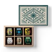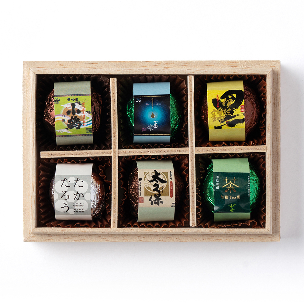 鹿児島県の6つの焼酎蔵から厳選された焼酎を用いて仕上げたボンボンショコラセットです。口中で広がる多彩な焼酎の風味をご堪能いただけます。薩摩切子をモチーフとした木箱入りパッケージに収められています。