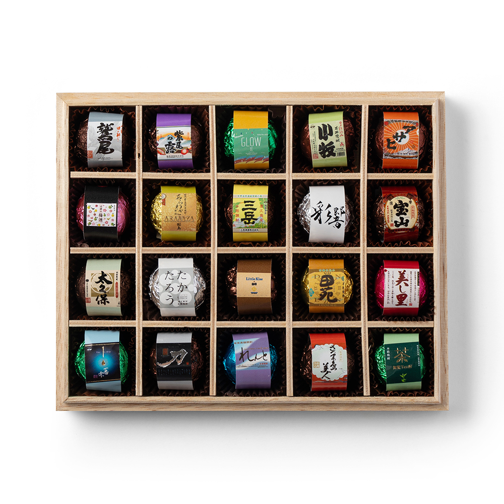 鹿児島県内の20の焼酎蔵から厳選された焼酎を用いて仕上げたボンボンショコラセットです。口中で広がる多彩な焼酎の風味をご堪能いただけます。薩摩切子をモチーフとした木箱入りパッケージに収められています。