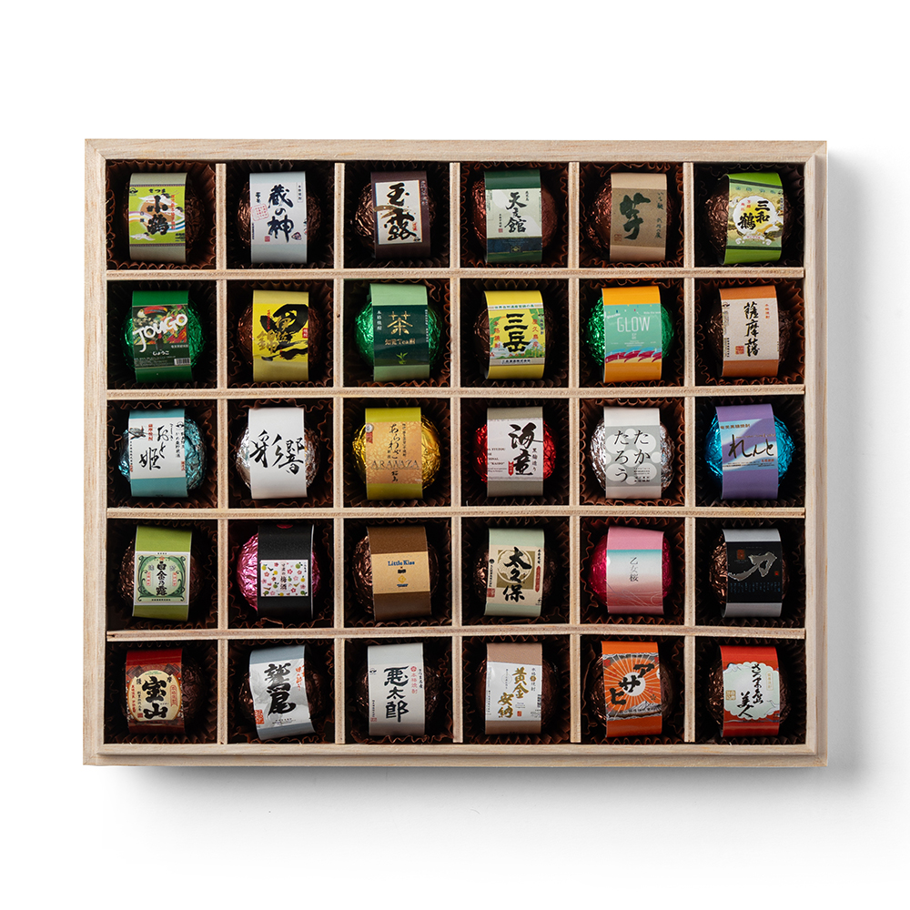 鹿児島県内30の焼酎蔵から厳選した焼酎を使用しております。口中に広がる多彩な味を存分にお楽しみいただけます。薩摩切子をイメージした木箱入りです。