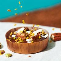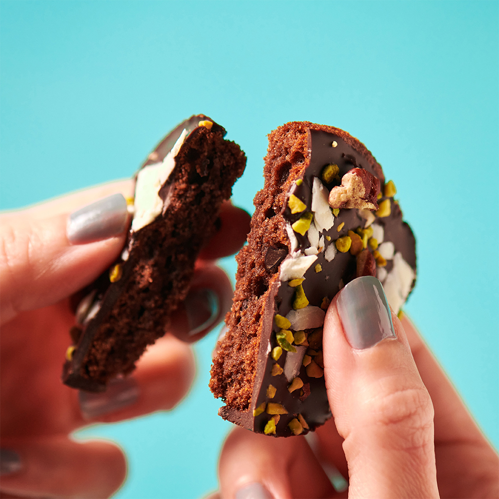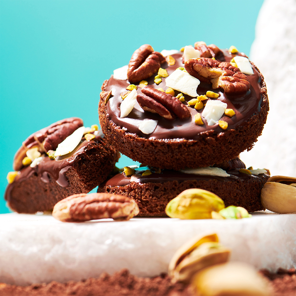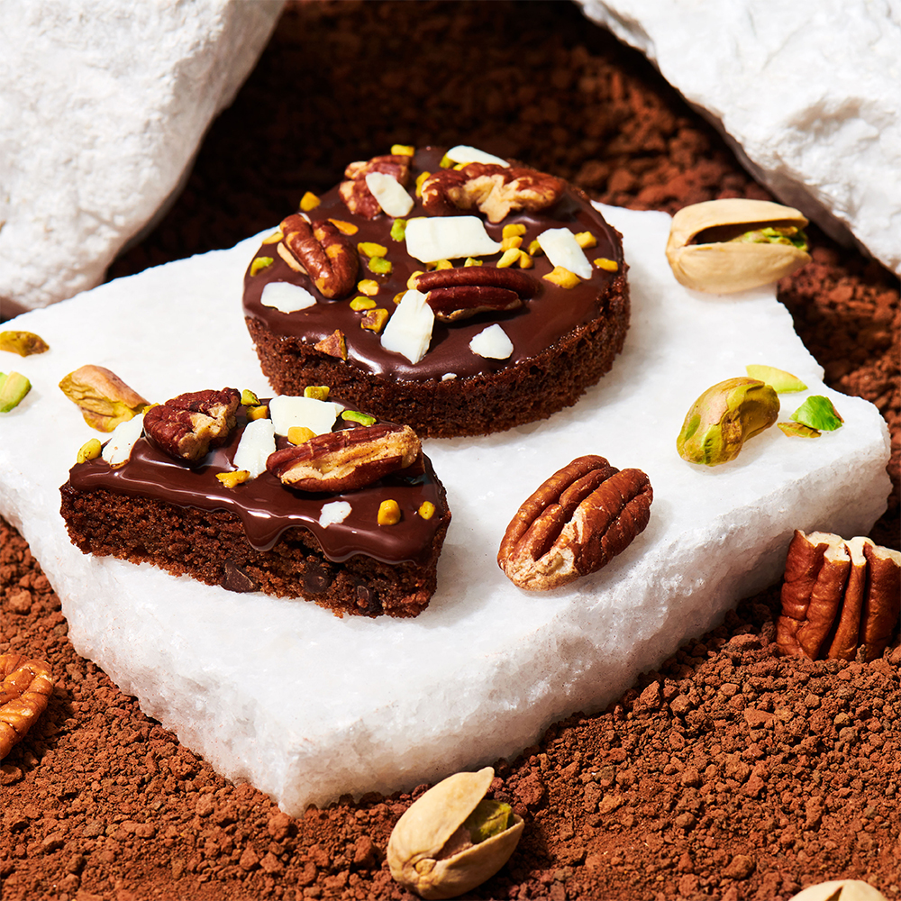 アーモンドパウダーとカカオパウダーを混ぜ込んだしっとり濃厚なブラウニー生地の上に、華やかな香りのダークチョコレートを広げ、ピーカンナッツとピスタチオをトッピングしました。多重奏のような食感と彩りの大人の甘さのブラウニーです。