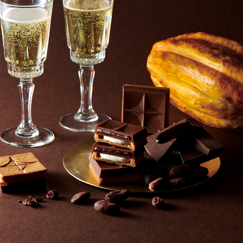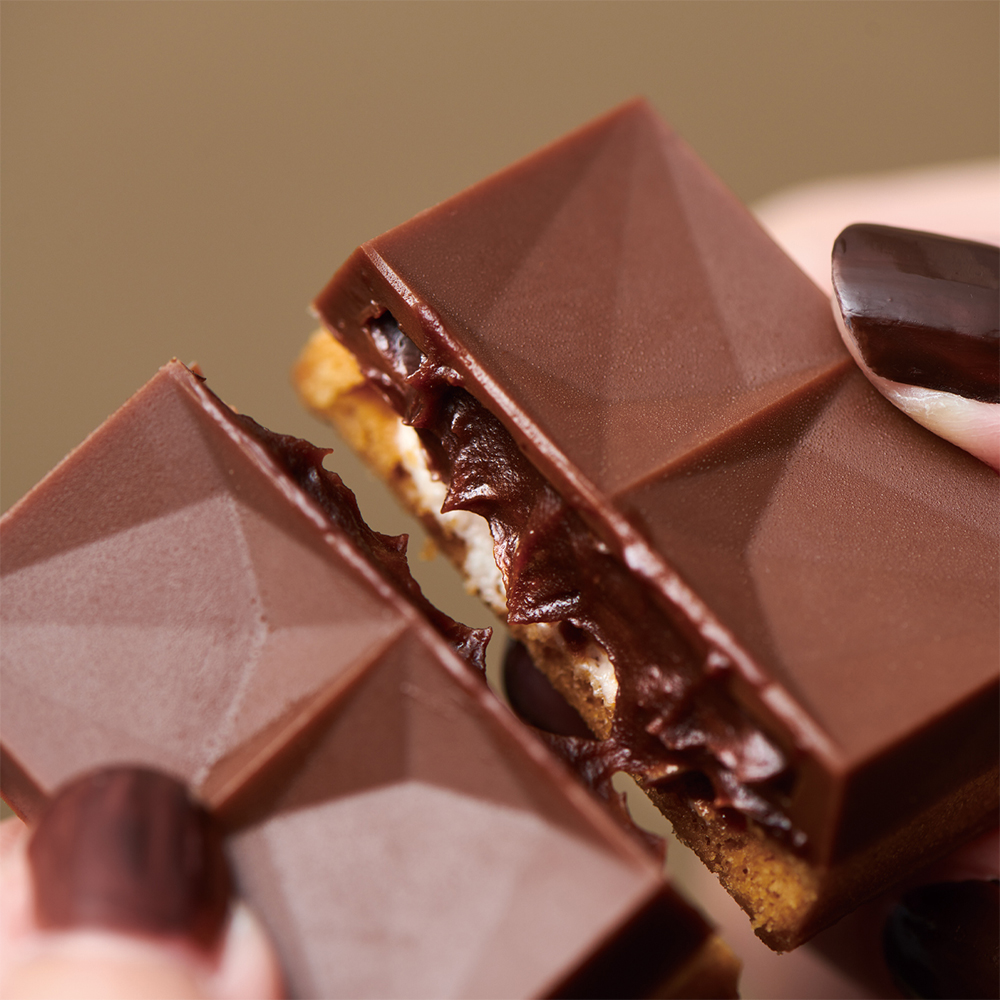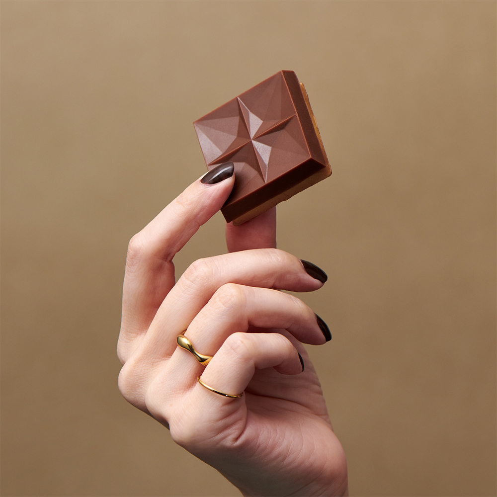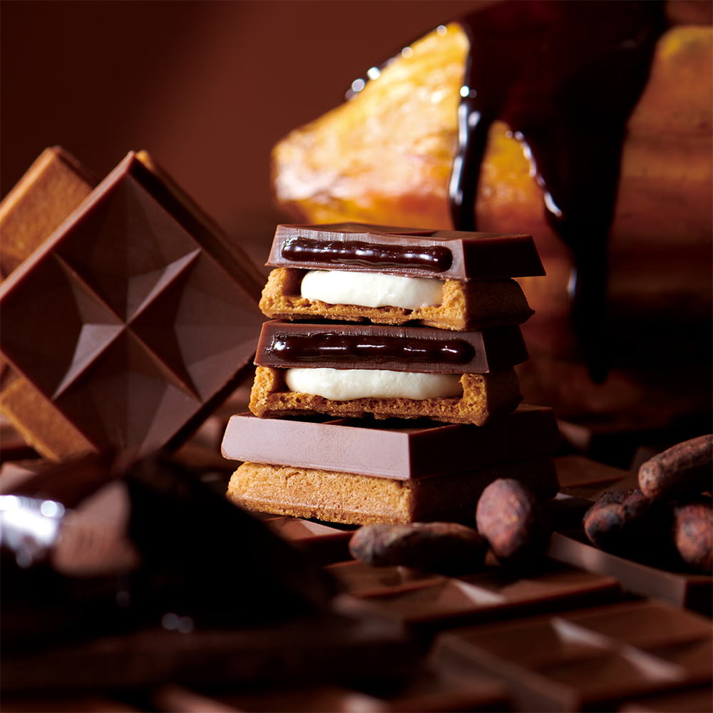クーベルチュールチョコレートを使用したキャレショコラを割ると、濃厚なキャラメルガナッシュがとろりと溢れ出します。口どけの良いバタークリームをクッキー生地とキャラメルガナッシュ入りのキャレショコラで挟み込み、食感が合わさることで、これまでのPRESS BUTTER SANDには無い奥行きのある新たな味わいを実現しました。キャレショコラは、フィリングをよりたっぷりと入れられる構造にデザインしています。