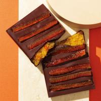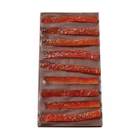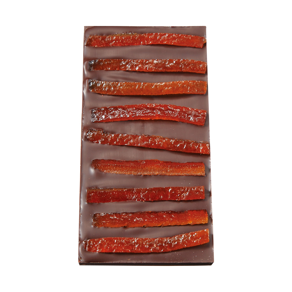 ノワールの甘さ控えめなチョコレートの中には、丁寧に作ったオレンジのピュレをたっぶりとタブレットの中に閉じ込め、外側にもぷっくりとしたオレンジコンフィを飾りました。