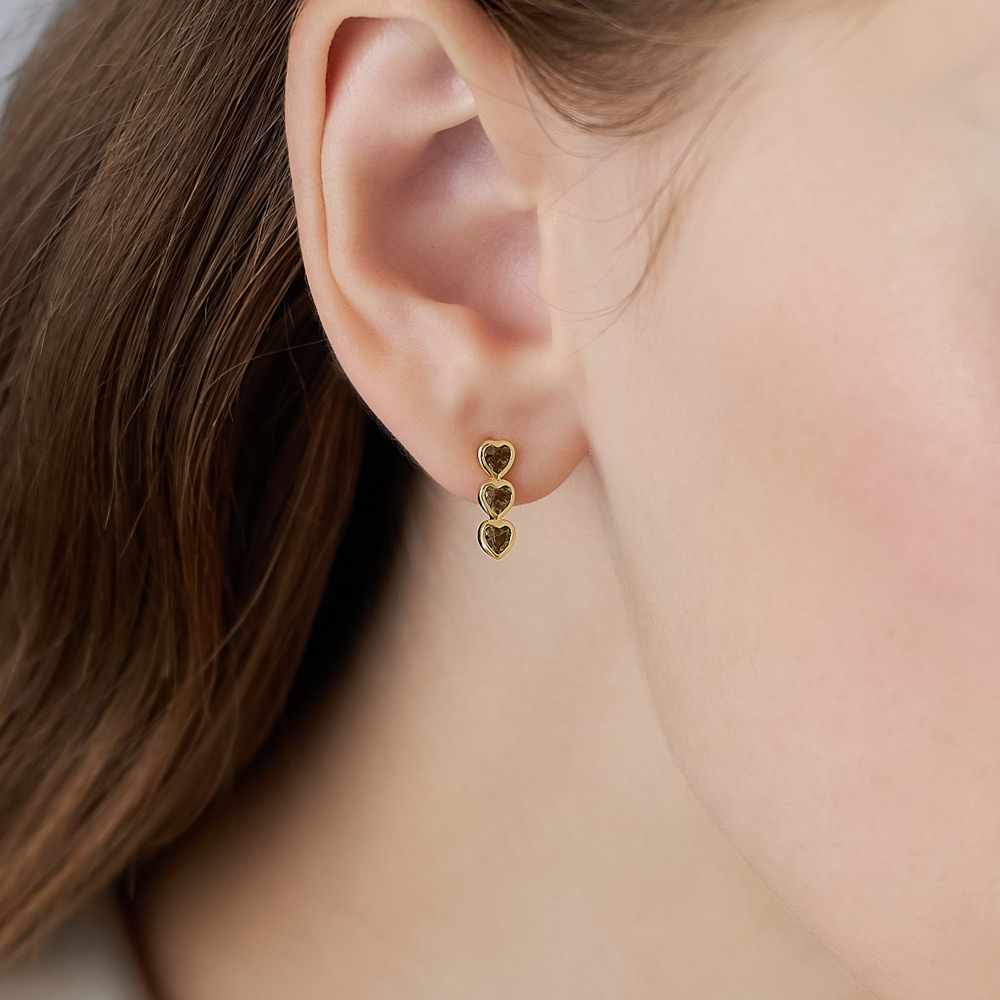 スモーキーなブラウンカラーのハートが3石連なったピアス。幸せの象徴ともされているハートモチーフは、モードなスタイルに甘さを加えこなれ感をプラスしてくれます。