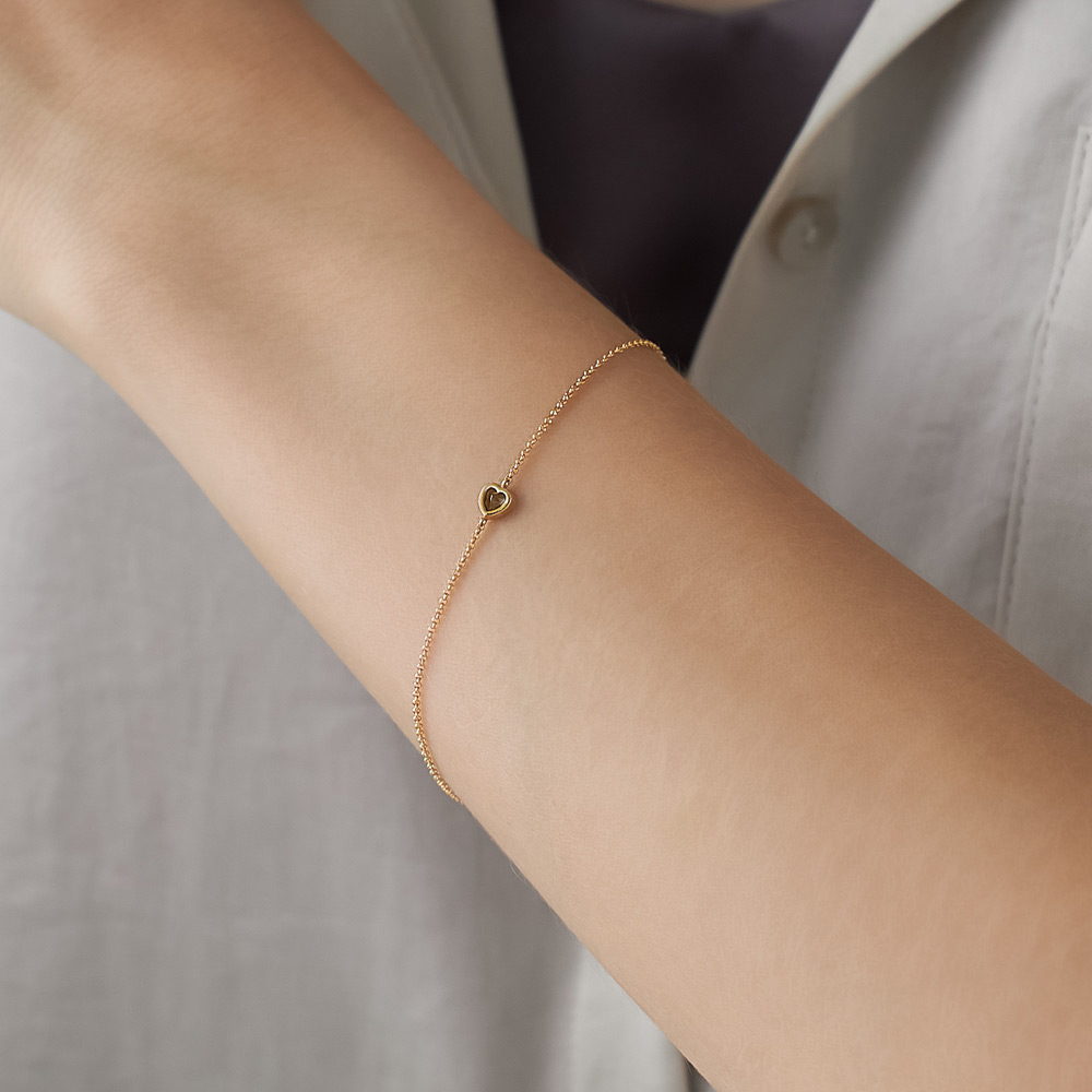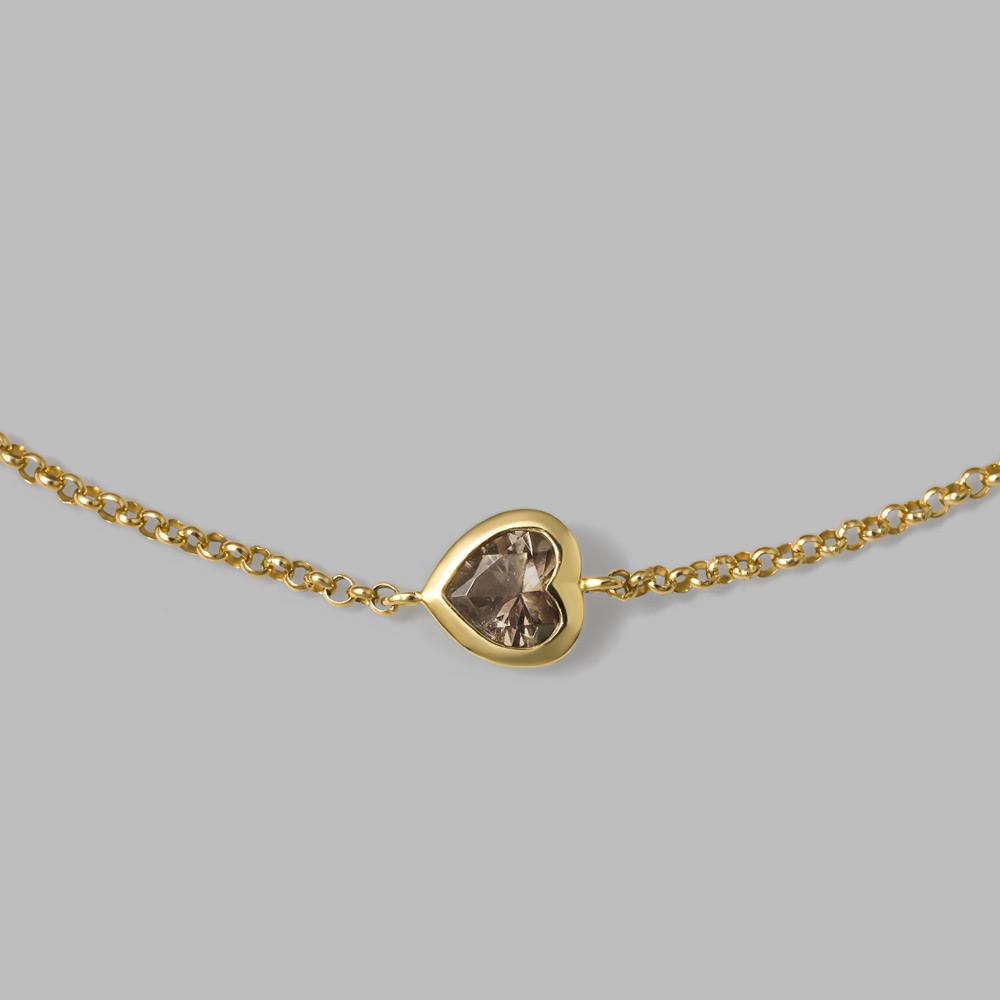 スモーキーなブラウンカラーのハートのブレスレット。身につけるとハートが自分を向いてくれるデザインで、肌になじむような輝きのチェーンも魅力です。幸せの象徴ともされているハートモチーフは、モードなスタイルに甘さを加えこなれ感をプラスしてくれます。