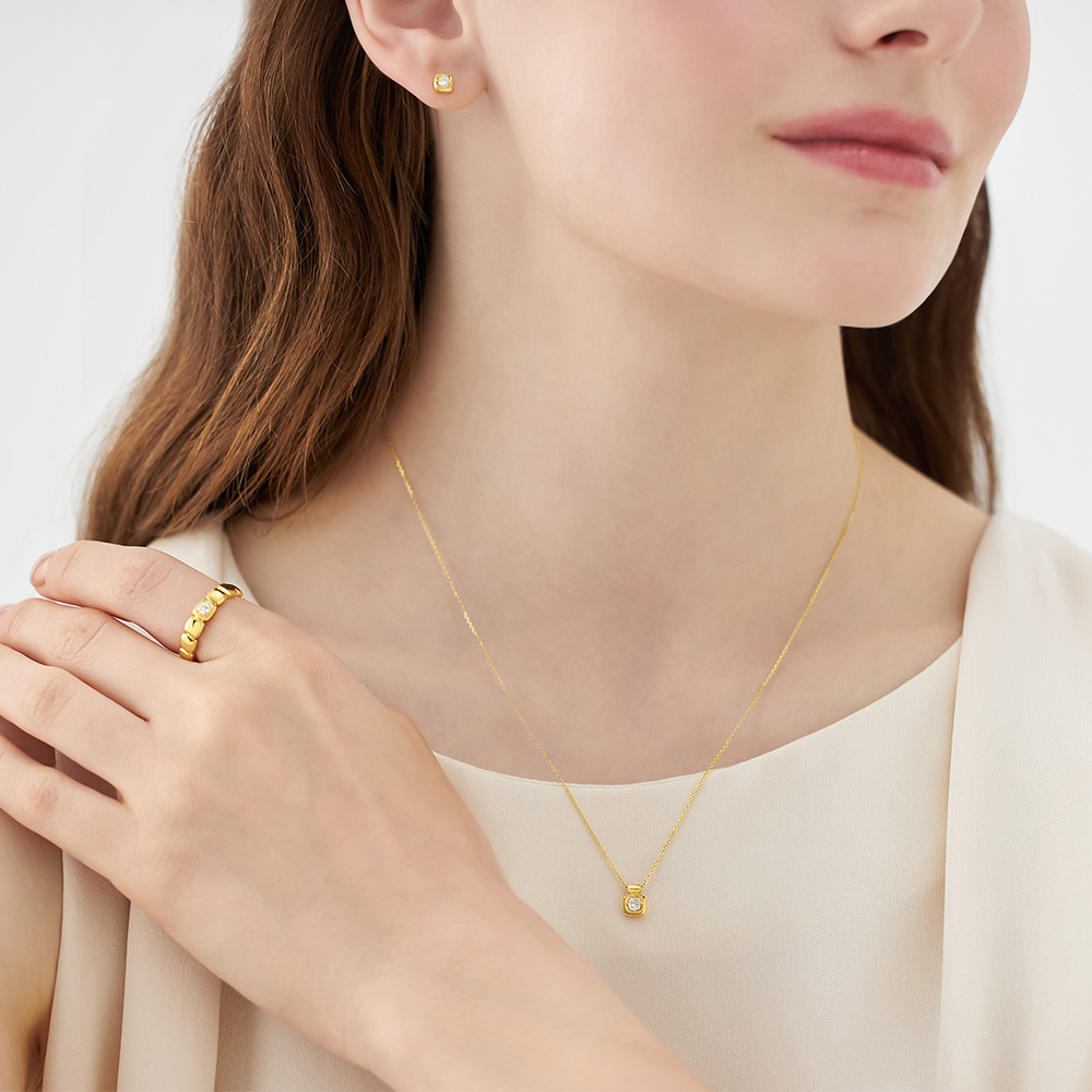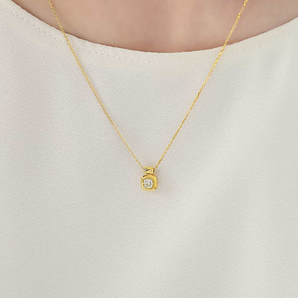 ひとつひとつの小さなしずくがやがて大きな流れを作り出し力強い流れへと変化する、そんなはじまりのひとしずくをイメージしたコレクション。クッションカットを引き立てる印象的な石座が魅力のラグジュアリーなネックレスです。