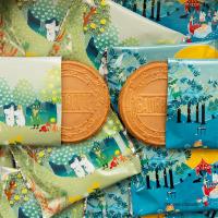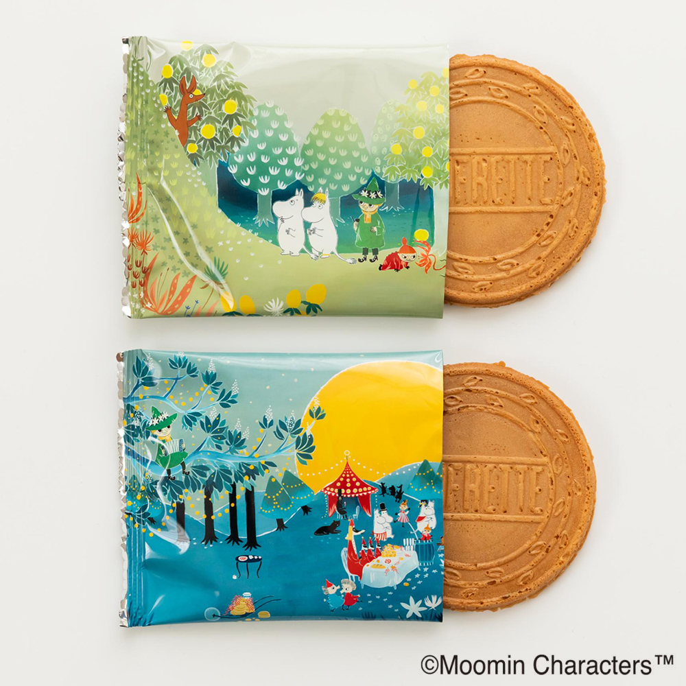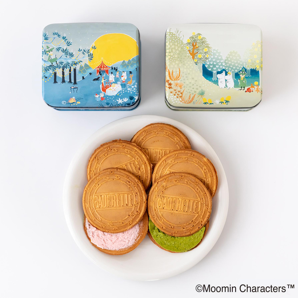 日本では出会える数が少ないムーミンアートがゴーフレット缶になって登場です。スウェーデンで有名な出版社「ボニエ・カールセン社」から出版された絵本のアートを鮮やかに再現。ムーミンのおなじみのキャラクターたちが水彩タッチで描かれた美しいデザインが魅力です。抹茶チョコクリームゴーフレットといちごのチョコクリームゴーフレットが2種類セットになっています。(1缶に個包装6枚入)。ご褒美やプチギフトにもピッタリな、かわいいアート缶です。