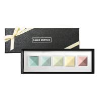 宝石のようなフォルムと鮮やかな色どりに、フルーツのみずみずしい味わいとホワイトチョコレートをおたのしみいただける、カカオサンパカ新作のセットです。「メンタ」自然な清涼感のペパーミントガナッシュをホワイトチョコレートでコーティング。「ココ イ ピニャ」ココナッツとパイナップルの練り込んだ南国の香り漂うガナッシュをホワイトチョコレートでコーティング。「リマ」爽やかな酸味が心地良いライムのガナッシュをホワイトチョコレートでコーティング。「ライチ ロサ」ローズの香りを纏わせたライチのガナッシュをホワイトチョコレートでコーティング。「カラメロ パッションフルーツ」パッションフルーツの甘酸っぱさをキャラメルがとろりと包みこみます。