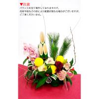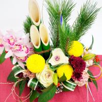 松や竹をはじめ縁起が良いとされるお花をたっぷり使った門松風の和風アレンジメントです。金銀の水引や迎春ピックもあしらい、いっそうおめでたく仕上げています。ボリュームもあり、新しい年を明るく、華やかに演出する花飾りとしておすすめです。
