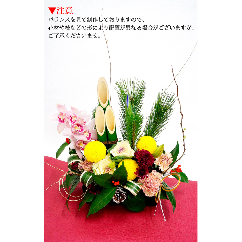 花:生花 松・ピンポンマム・シンビジューム・葉ボタン・千両など、器:プラスチック