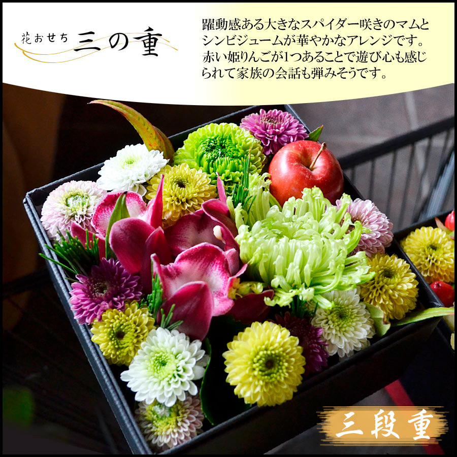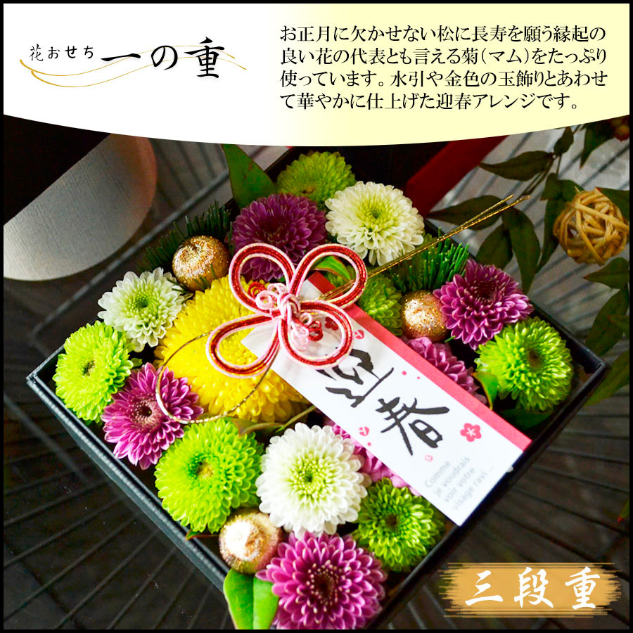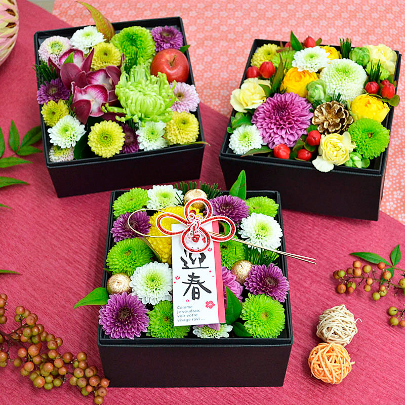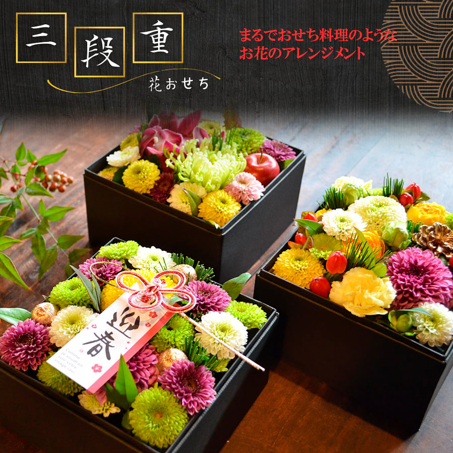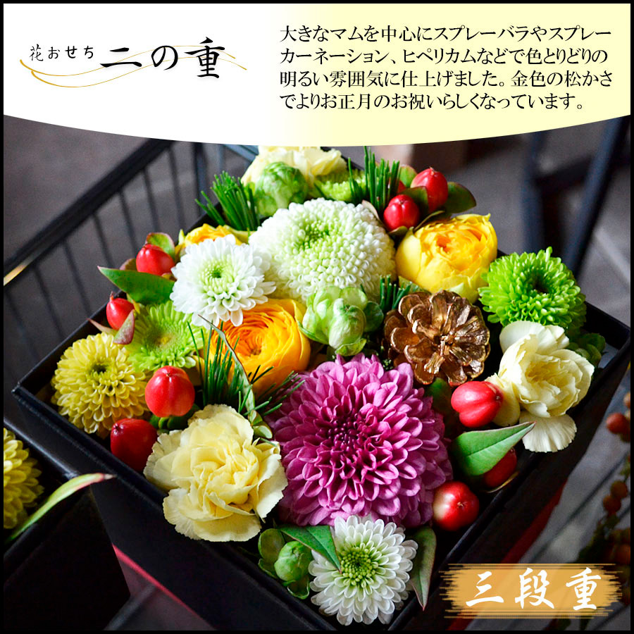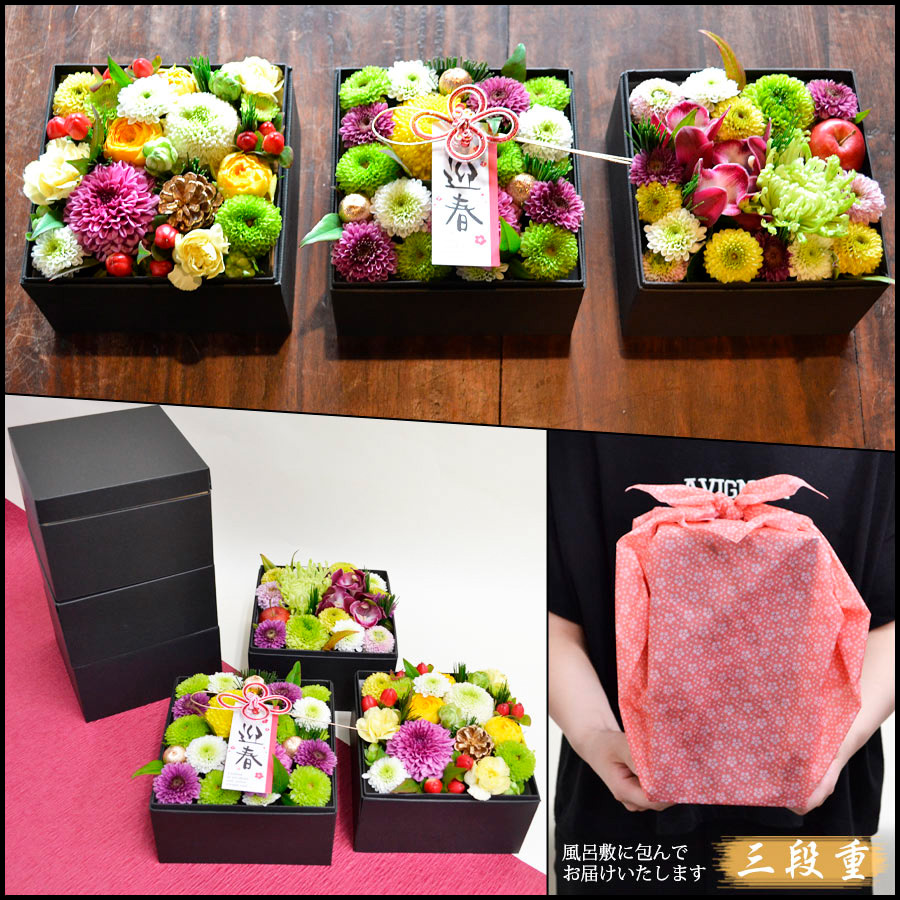 3段のお重箱ボックスにお花を敷き詰めてお正月らしい雰囲気に仕上げたアレンジメントです。お正月のご馳走と一緒に並べて飾ったり、一つずつ別の場所に飾るなど、様々な形で楽しんでいただけます。新年のおめでたい宴の彩におすすめです。風呂敷に包んでお届けいたします。