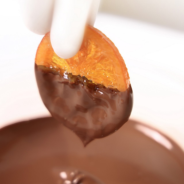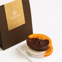 まるでフレッシュなオレンジを味わうように厚切りにスライスし、オレンジとレモンの果汁と甘さ控えめなシロップで何日も時間をかけて煮込み、素材の甘さを引き出しました。相性の良いダークチョコレートとホワイトチョコレートをまとわせて、香り高いオレンジとのマリアージュをお楽しみいただけます。