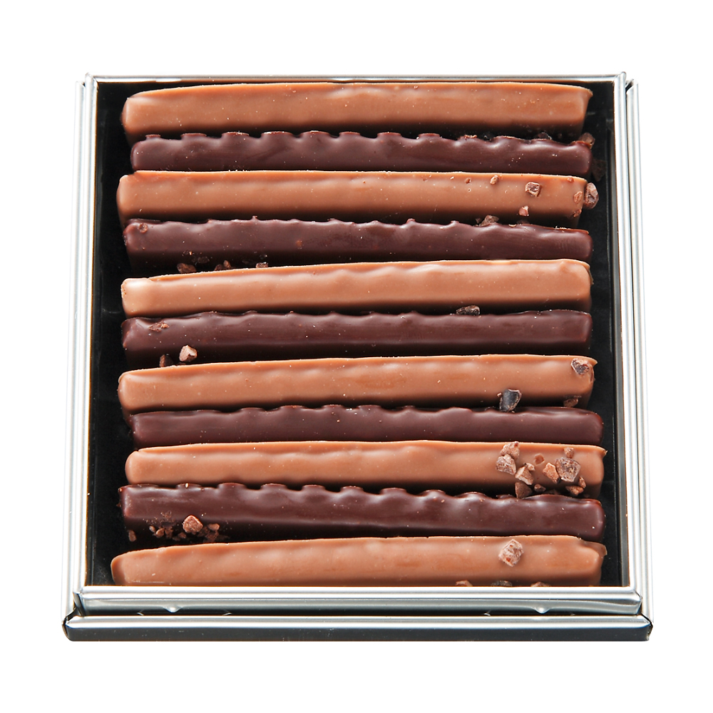 こだわり抜いたブラジル産コーヒーを使用したプラリネを、ミルクとダークのチョコレート2種でコーティング。豊かなコーヒーの風味とナッツの香ばしさ、チョコレートのまろやかな甘さが絶妙に絡み合い、まさに三位一体の味わい。食べやすくお洒落な板状タイプは、少しずつゆっくりと食べられるよう考え出したシェフご自慢のシェイプ。ひとかけら口にするたびに広がるコクと深みは、大人のための贅沢なひとときを演出します。上質な時間に寄り添う洗練されたショコラをぜひお楽しみください。
