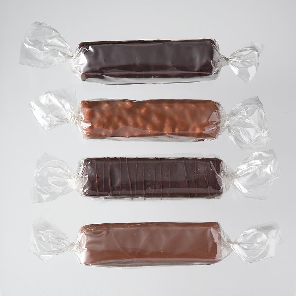 4種 計4個[(1)プラリネ・トンカ×塩バターキャラメル(ダーク)(2)プラリネ・ピーナッツ×塩バターキャラメル(ミルク)(3)プラリネ・セサミ×塩バターキャラメル(ダーク)(4)プラリネ・ヘーゼルナッツクリスピー×塩バターキャラメル(ミルク)]