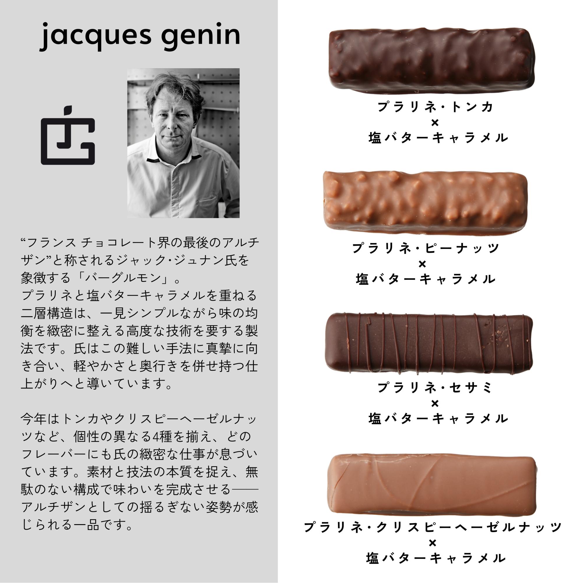 パリ本店でも大人気のバーグルモンは、シェフの肝いりで創作されたこだわりのショコラ。初登場で甘い香りが特長のトンカ豆や、セサミ、ピーナッツなどのプラリネと、塩味が絶妙な塩バターキャラメルを2層に重ねて丁寧に仕上げた一品。香り、味わい、食感が折り重なり、甘さをおさえた繊細なバランスで、ジュナン氏の探求心と情熱が伝わるショコラです。