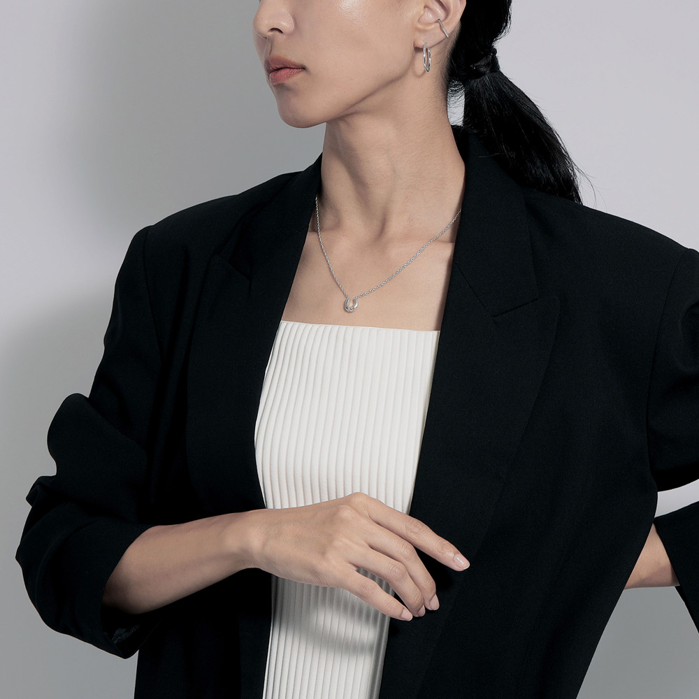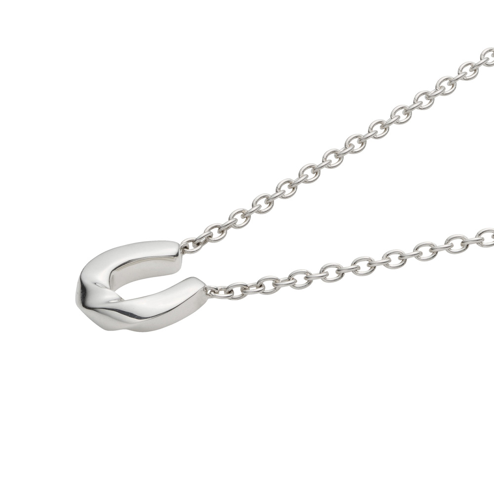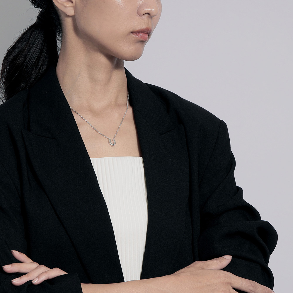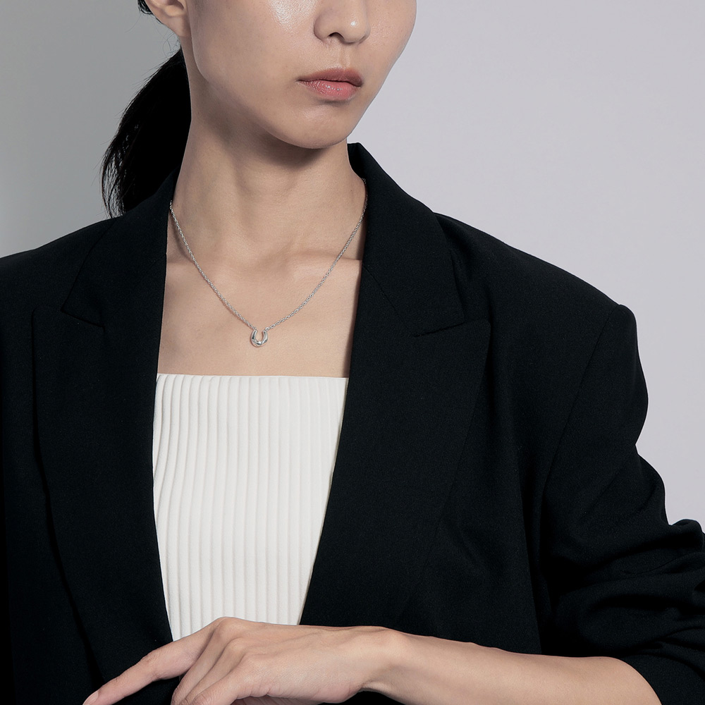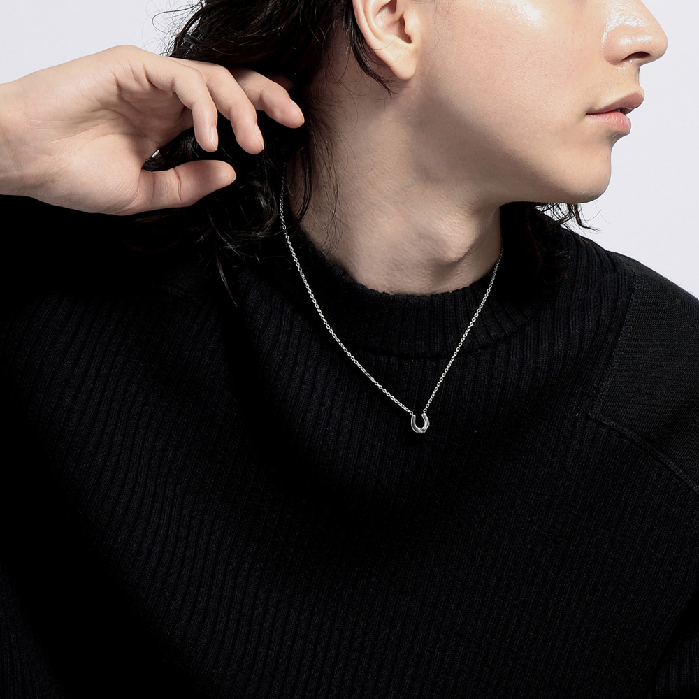 スタイリッシュなバーの部分とポイントでデザインされた流れるようなディティールのコントラストを楽しめるデザイン。 流線の形状がメビウスの輪の様な終わりのない形を連想させてくれ、奥行きを感じさせるデザインに。 上向きの馬蹄は幸運を受け止め、幸運を貯めると言われるラッキーモチーフでもあり、パートナージュエリーとしてもおすすめです。