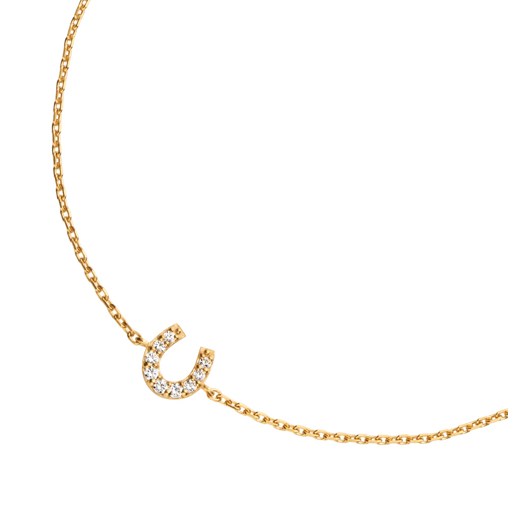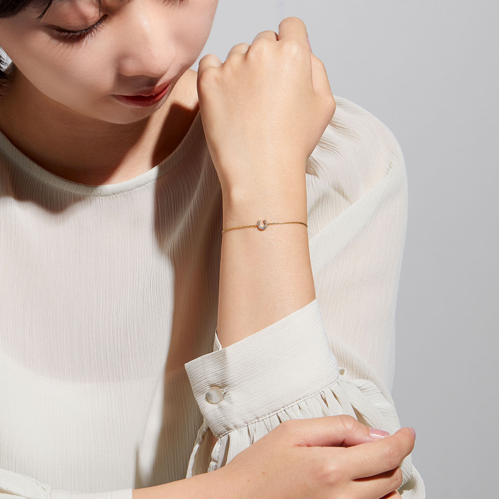 キュービックジルコニアのきらめきでラインを描いたような、ホースシュー(馬蹄)モチーフのブレスレット。『幸せを呼び込んで逃がさない』と言われるホースシュー(馬蹄)モチーフは、お守りジュエリーとしてもおすすめです。