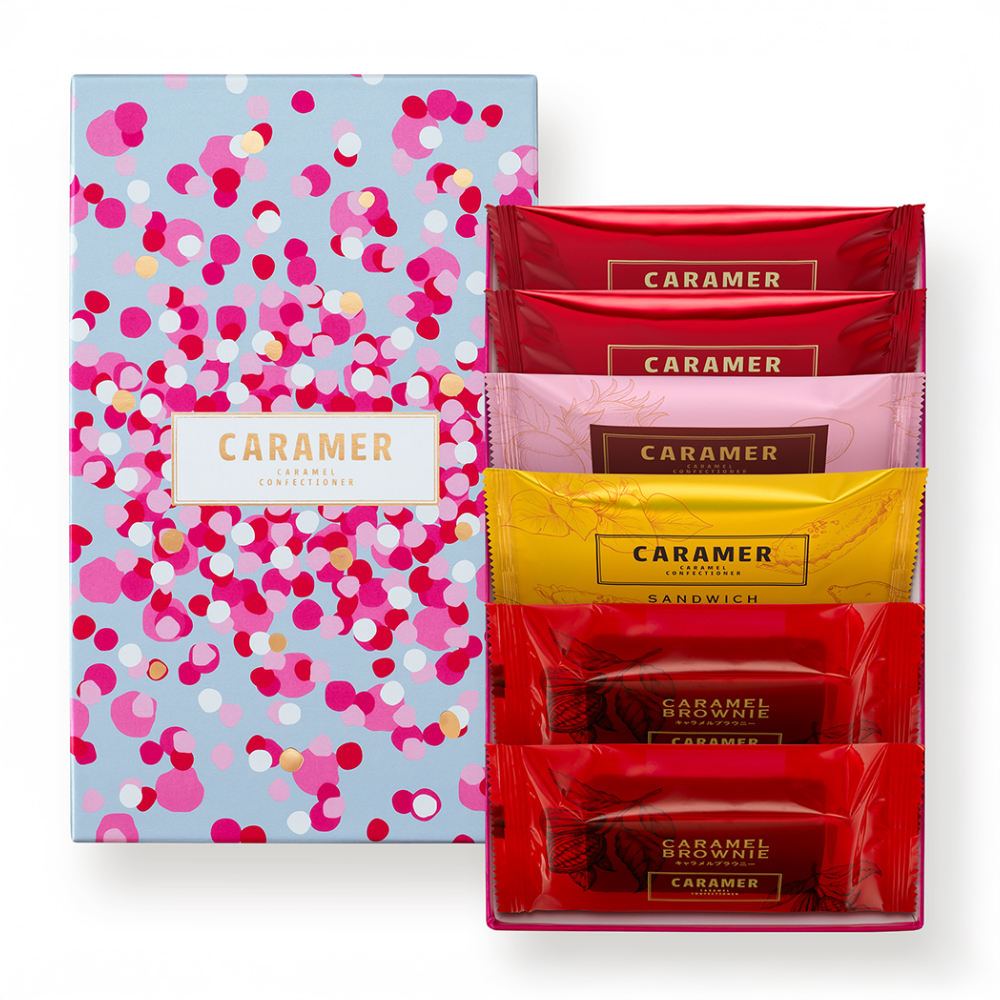 香ばしく華やかな甘さのアーモンドフロランタンとバターサブレで、とろけるキャラメルとミルクチョコレートをサンドしたキャラマーサンドをはじめ、期間限定の新作フレーバーなど様々な表情を持ったキャラメル菓子をバレンタイン限定のデザインボックスにアソートしました。