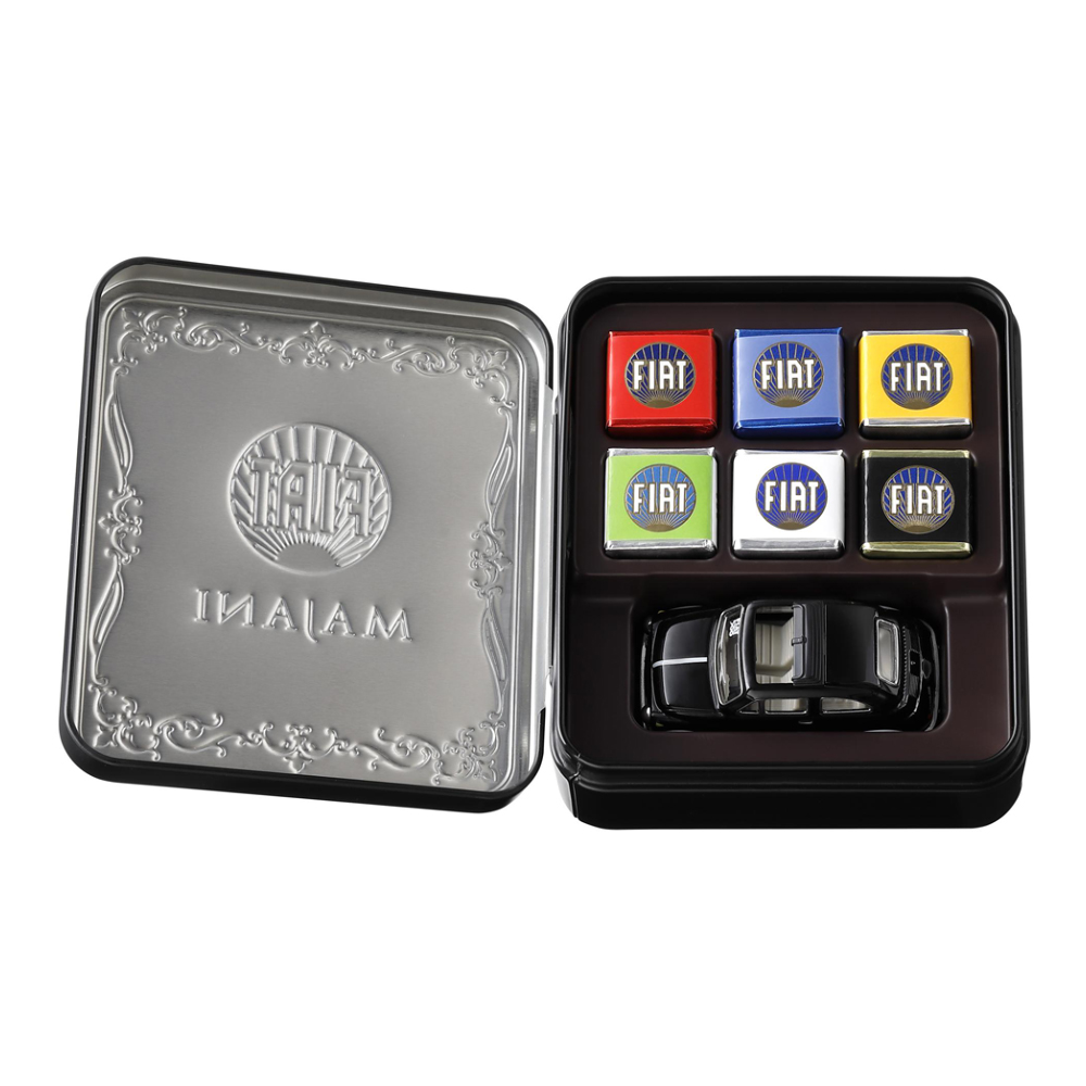 Fiatチョコレート6粒(クラシコ、ノワール、エクストラノワール、ピスタチオ、フリーダム、カルメル)、1/48Fiat500プルバックミニカー ※Fiat500キーチェーン(お色はお選びいただけません)