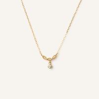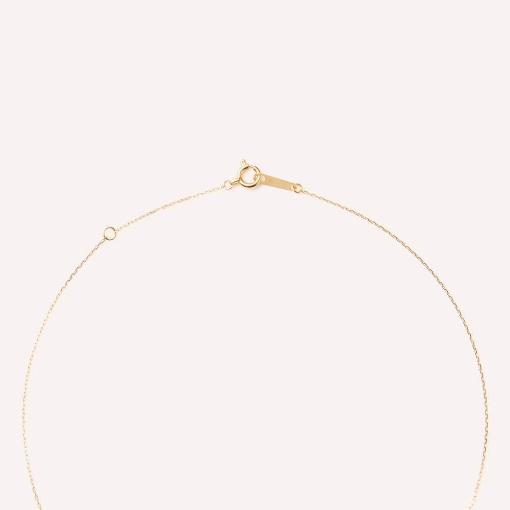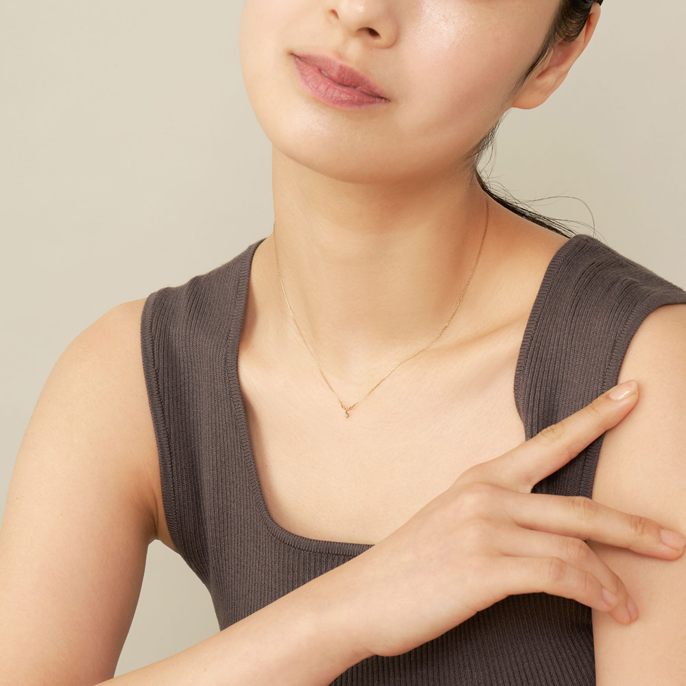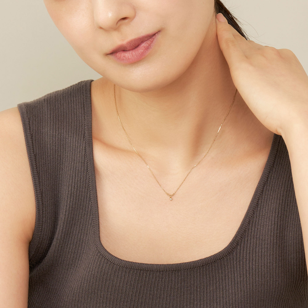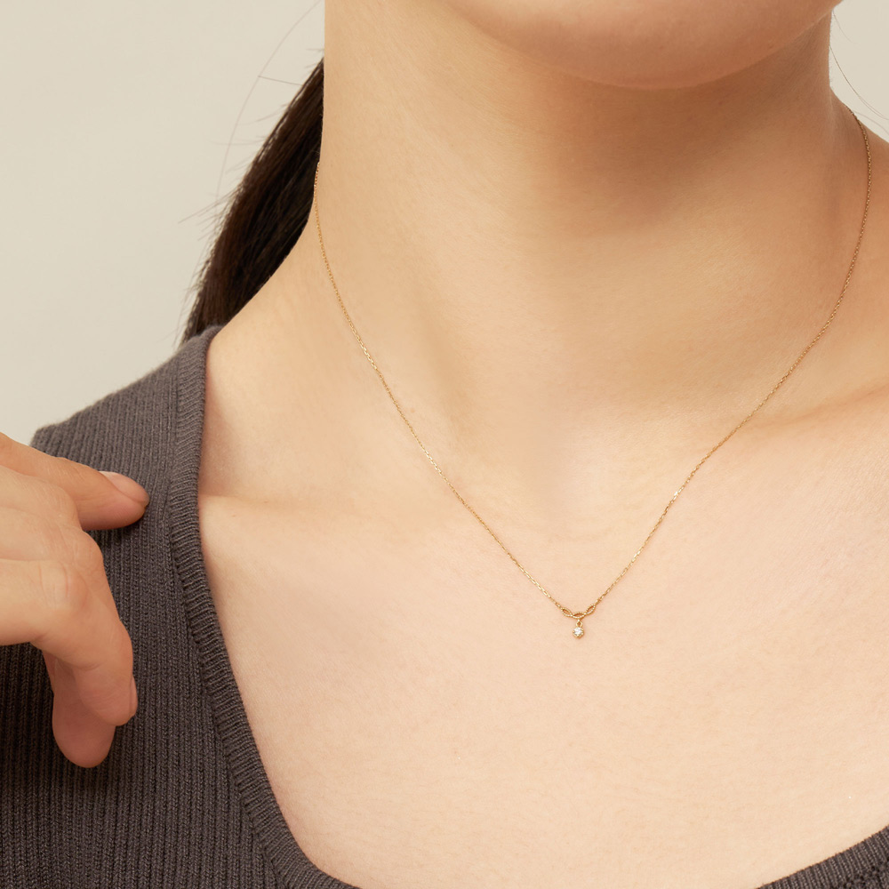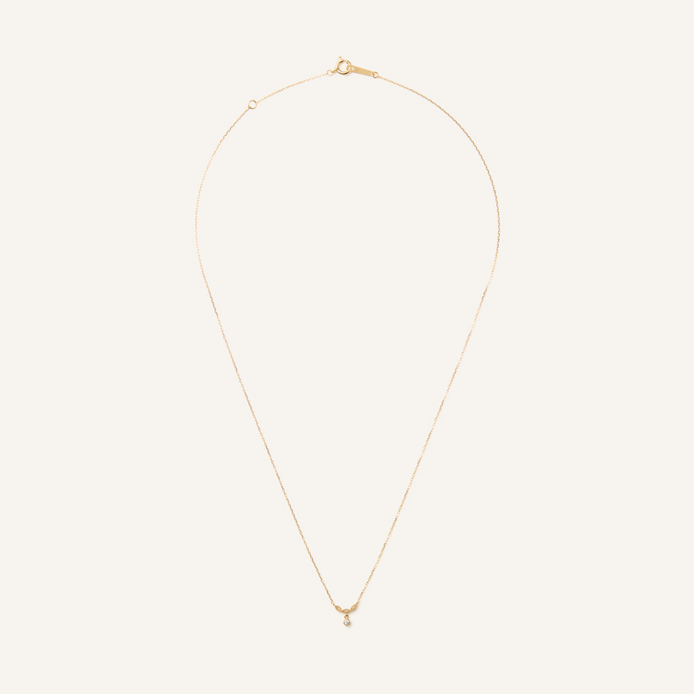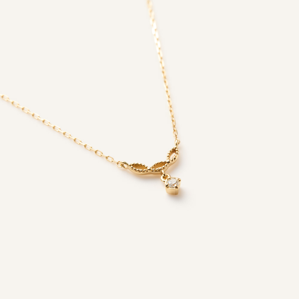 トップはふんわりと丸みを帯びた3枚の葉っぱが連なったようなレースの模様。 レース模様の下に1石のダイヤモンドがきらめきを放ちます。トップはデコルテに沿うようにUラインを描いています。※2026年1月12日迄の期間限定プライス