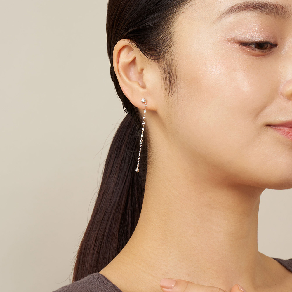 トップのキュービックジルコニアは6 枚の花びらで優しく石を包みこむようにセッティングされています。 繊細にかたどられた花のモチーフが可憐な印象です。 6枚花の花言葉には「思いやり」「愛情」「希望」「絆」などの 素敵なメッセージが多く、贈る人の気持ちをそっと届けて くれます。