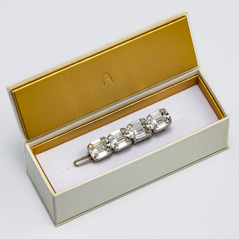 「HOLIDAY COLLECTION2025」美しいスクエアシェイブのクリスタルが光を放つ、ヘアピン。過度な装飾を削ぎ落としたシャープさの中に愛らしさを宿したデザインで、モードな雰囲気を演出。ヘアアレンジやその日のスタイリングでベストなものをセレクトできるよう、ミニ、スモール、ロングの3サイズ。スモールサイズは、5.5cmとバランスの良い長さで、ホリデーシーズンの様々なスタイルをドレスアップしてくれる。HOLIDAY COLLECTIONのためだけに作られた専用プレミアムボックス付きで、大切な方への贈りものにおすすめです。