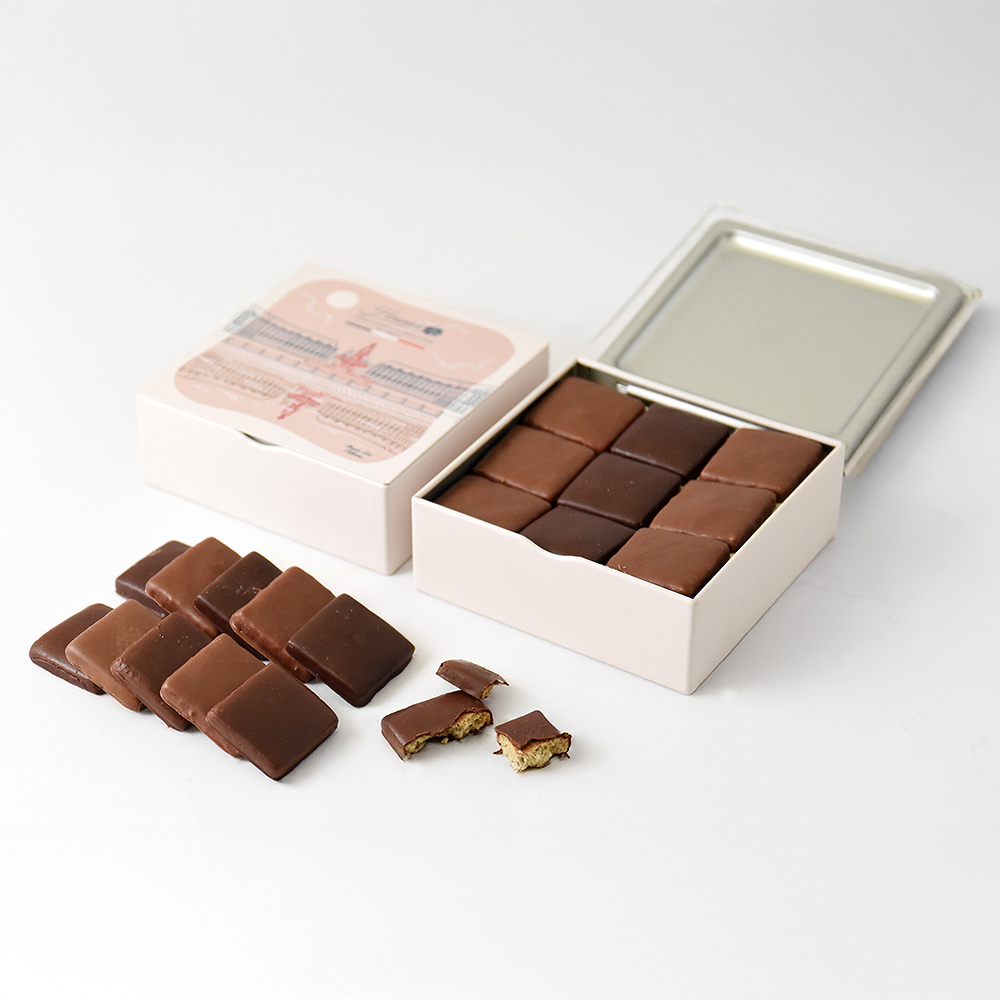 ベルガモット、ココナッツ&バニラ、ジャスミン。散歩道で出会うような草木の香りを閉じ込めた3種のサブレをビーントゥバーのショコラで包みました。(1)ベルガモット:芳醇な紅茶と爽やかな柑橘の香りが出会って生まれた心洗われるフレッシュな香り。柑橘系の爽やかなフレーバーが、コーティングのショコラノアールでぐっと引き締まります。(2)ココナッツ&バニラ:ココナッツとバニラが溶け合って引き出す、甘い香り。ショコラオレでコーティングされ、甘い誘惑的な香りが一層際立ちます。(3)ジャスミン:ジャスミンの茶葉と花が、早朝に開く花を想わせるクリーンな香りが特徴的です。