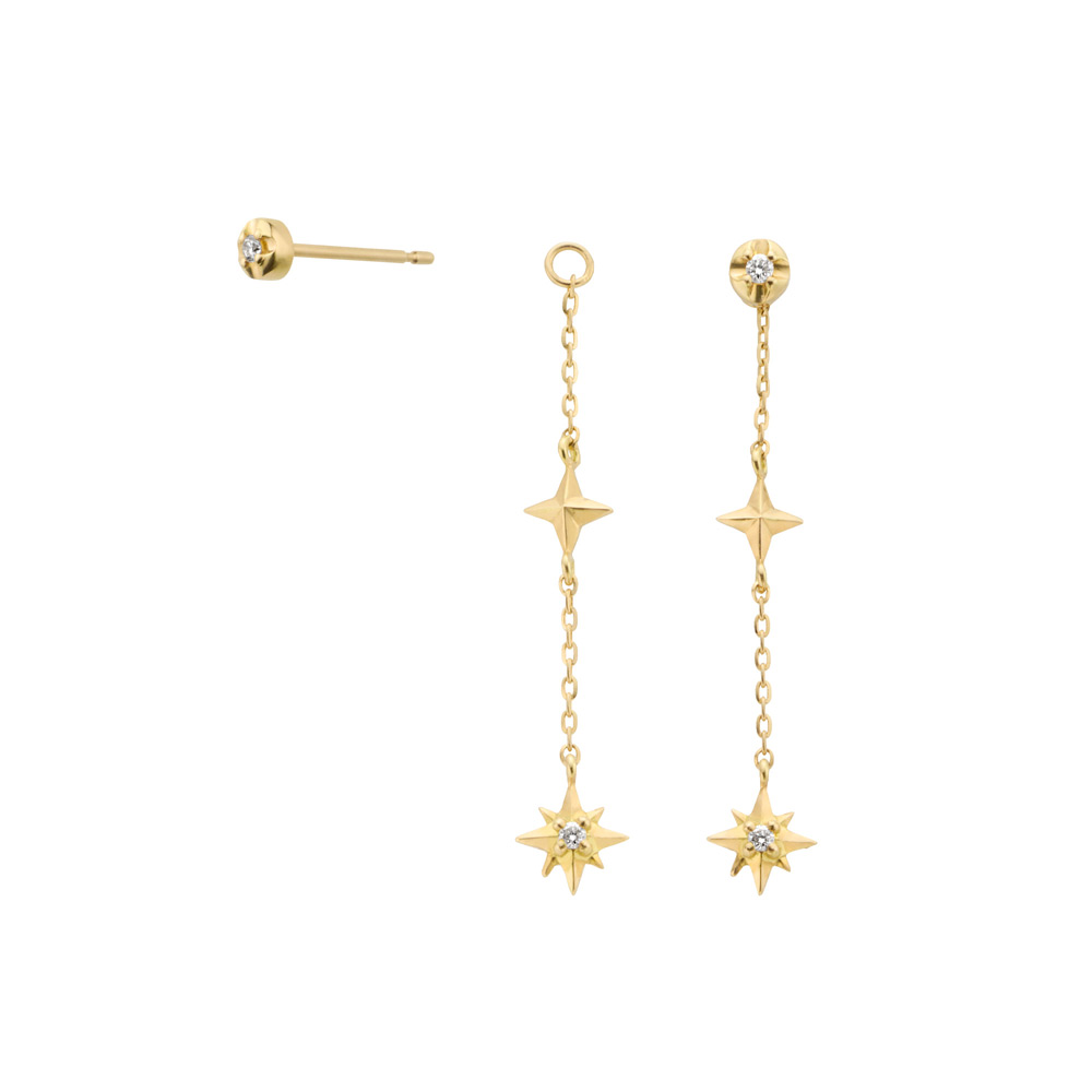 程よい長さのチェーンに、2つの煌めきのモチーフをあしらいました。繊細さを感じさせる煌めきには、ダイヤモンドをあしらうことでより華やかな輝きを、細かなカットが施されたチェーンには、十字の煌めきが艶やかに輝き、デザインのアクセントに。仕草に合わせ耳元で揺れ、横顔にエレガンスを感じさせます。トップは円く粒感のある石座が艶やかに磨かれ、あらゆる方向から反射する光がダイヤモンドを輝かせます。パーツを取り外すと、シンプルなダイヤモンドスタッドピアスとしても使え、さりげない輝きを添えてくれます。