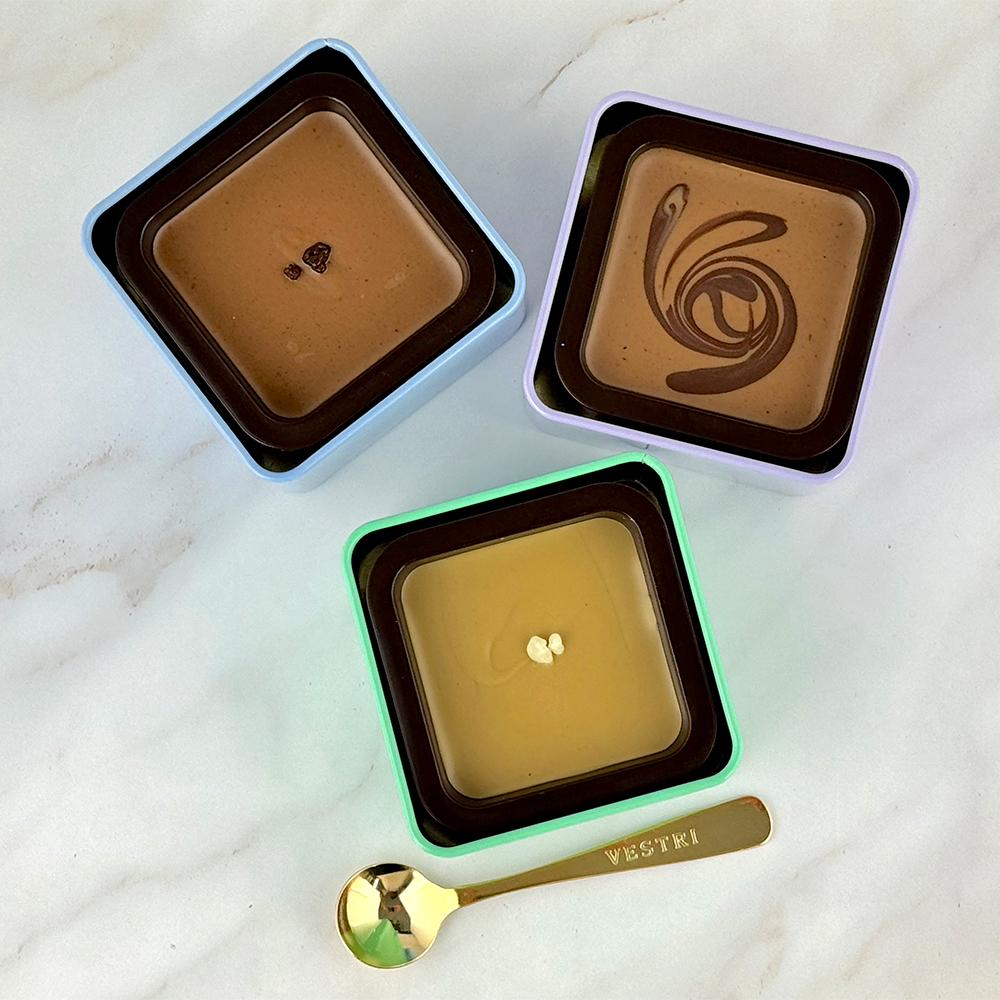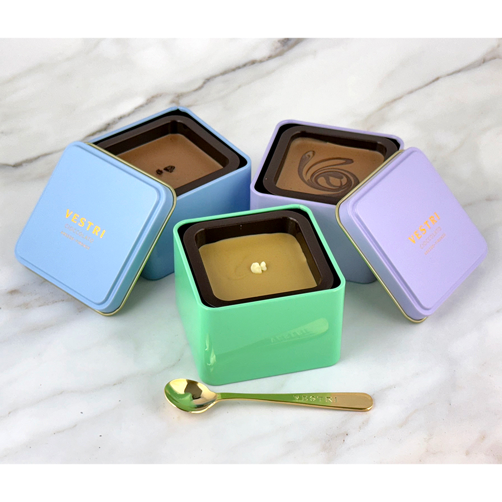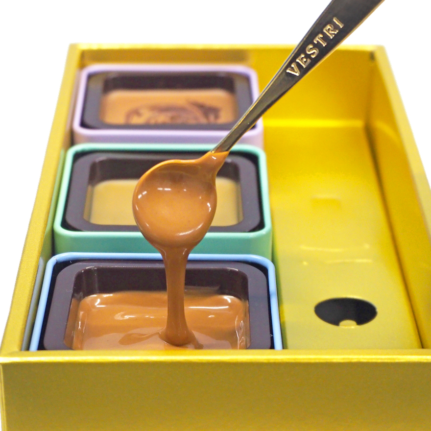 VESTRIの代表商品、金のスプーンですくって食べるチョコレート。人気No.1~3の、ミルクジャンドゥイア、ピスタチオ、塩ヴァニラのセットです。人気フレーバーでボリュームもあり、プレゼントに最適です。