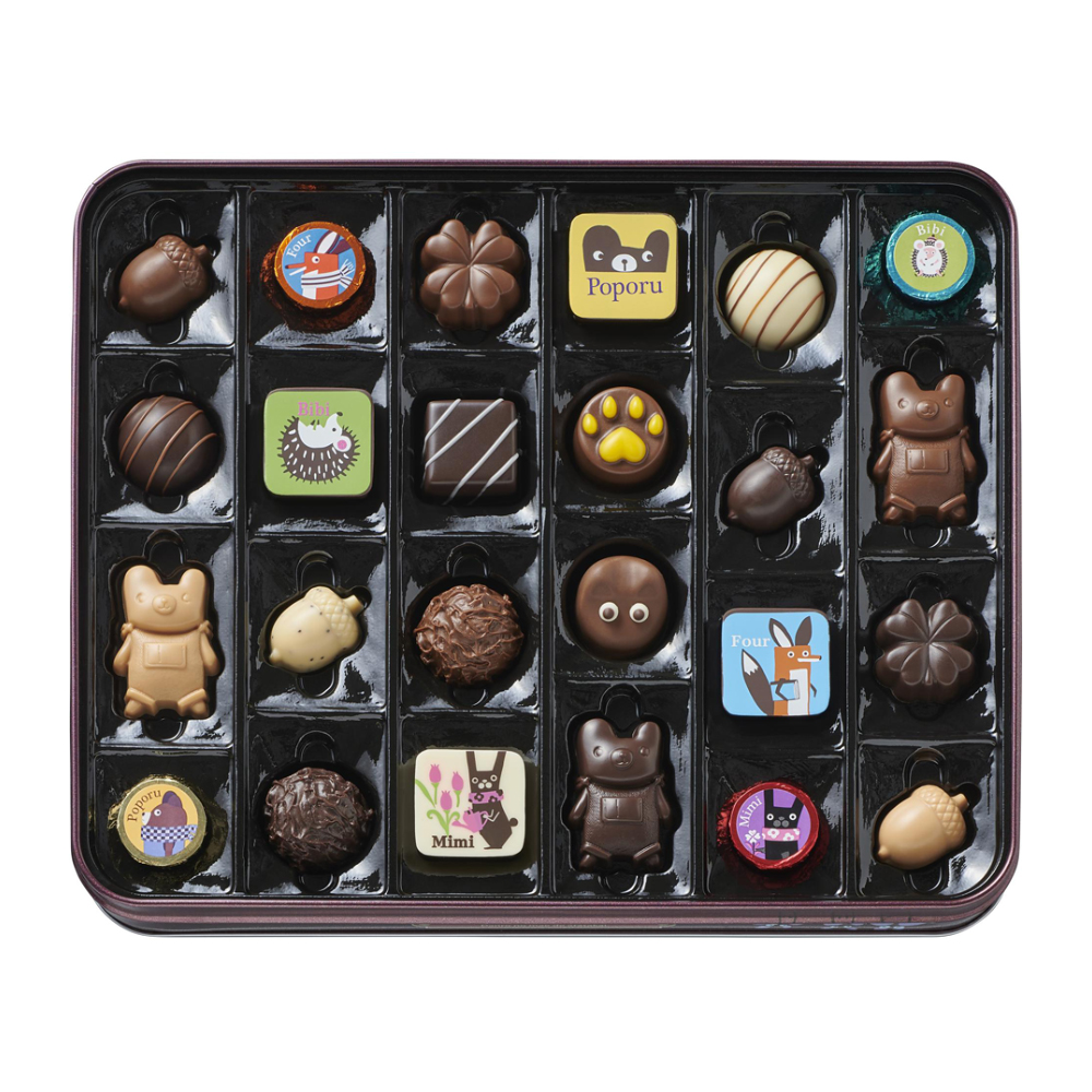 癒し系のこぐま「ポポル」と仲間たちをモチーフにしたチョコレートブランド。外国の絵本をイメージした、ほっこりと気持ちが温かくなるような素敵な世界観のパッケージ。詰め合わせのチョコレートは、ポポル型やどんぐり型、プリントチョコレートなどのキャラクター性のあるチョコレート、トリュフやピーカンナッツ味、茶葉入りロイヤルミルクティー味のチョコレートなど、見た目にも味にもこだわりました。