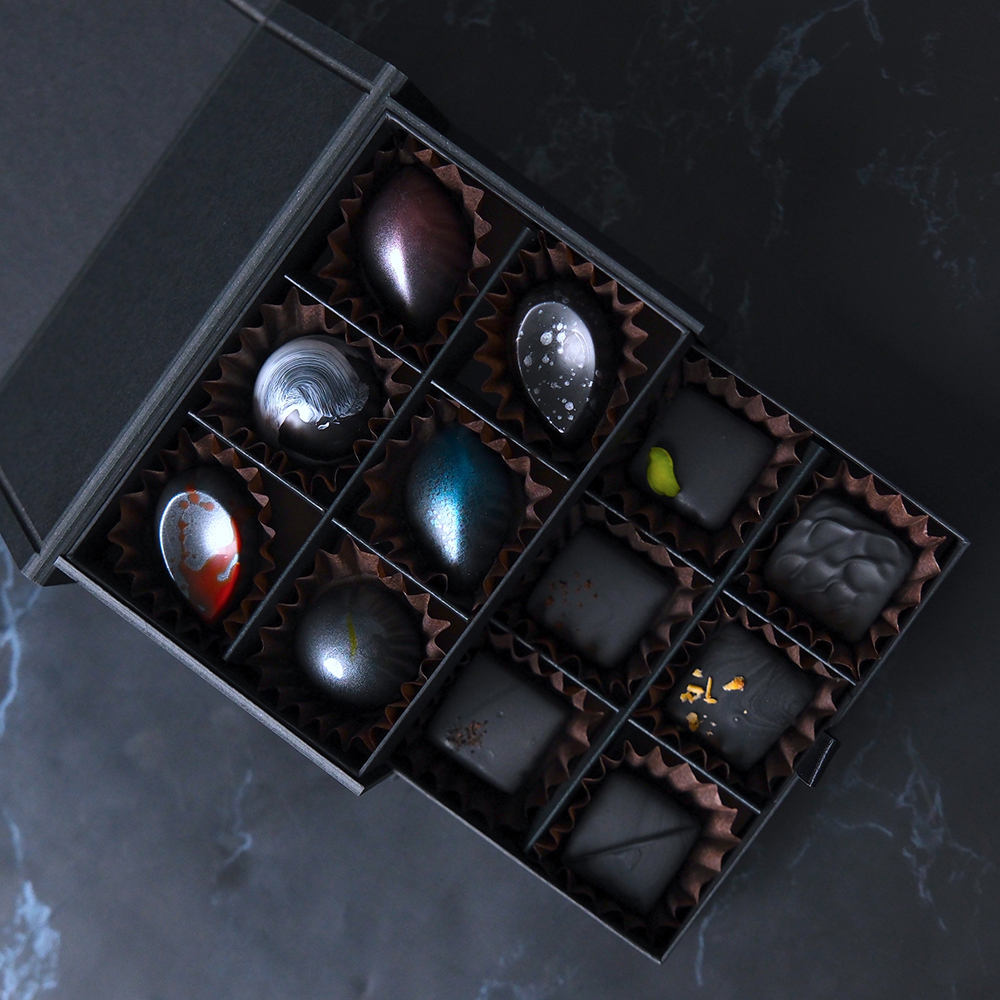 [Noir Edition]BLVCK PARIS BONBON CHOCOLAT - 12粒アソート(二段構成)上段には香りを重ねた「Layer Collection」、下段には王道の「Classic Collection」。それぞれが異なる個性を持ちながら、すべてが「黒」で調和する二段構成。濃密なガナッシュの余韻、果実とナッツが織りなす香りのグラデーション、そして繊細なチョコレートの口溶けが、深淵なる黒の世界へと誘います。「Noir Edition」は、BLVCK PARISが提案する究極のショコラ体験。ジュエリーケースを開けるような高揚感とともに、一粒ごとに異なる香りのストーリーをお楽しみください。(上段)[Layer Collection]BLVCK PARIS BONBON - 6粒アソート CHOCOLAT カシス×ダークチョコ、フランボワーズ×ホワイトチョコ、キャラメル×塩、ライチ×ココナッツ、トンカ豆×フィヤンティーヌ、クリームチーズ×フィヤンティーヌ。6つのペアリングが奏でる香りと食感の多層的なハーモニー。果実の酸味、ナッツの香ばしさ、チーズのコク、それぞれが「黒」の中で静かに溶け合い、ひと粒の中に奥行きのある余韻を描き出します。香りの階層美を愉しむためのアートショコラ「Layer Collection」。黒の奥に潜む、多層の美学をお届けします。(下段)[Classic Collection]BLVCK PARIS BONBON CHOCOLAT - 6粒アソート ピスタチオ、バニラ、紅茶、コーヒー、ヘーゼルナッツ、VSOP。6つのフレーバーが織りなす王道のショコラ体験。それぞれのガナッシュを特別にブレンドしたチョコレートで包み、香り・苦味・甘みが調和する、シンプルでありながら完成された味わいです。マットな黒の表面にわずかな艶を纏い、一粒ごとに異なる個性を放つ「Classic Collection」。BLVCK PARISの哲学を最も純粋に表現した、ブランドの原点とも言えるセレクションです。贈り物にも、ご自身へのご褒美にもふさわしい「食のアートコレクション」。「黒」という色に潜む美しさと情熱を、ひと粒に閉じ込めたBLVCK PARISのボンボンショコラで、味覚のラグジュアリーをお楽しみください。