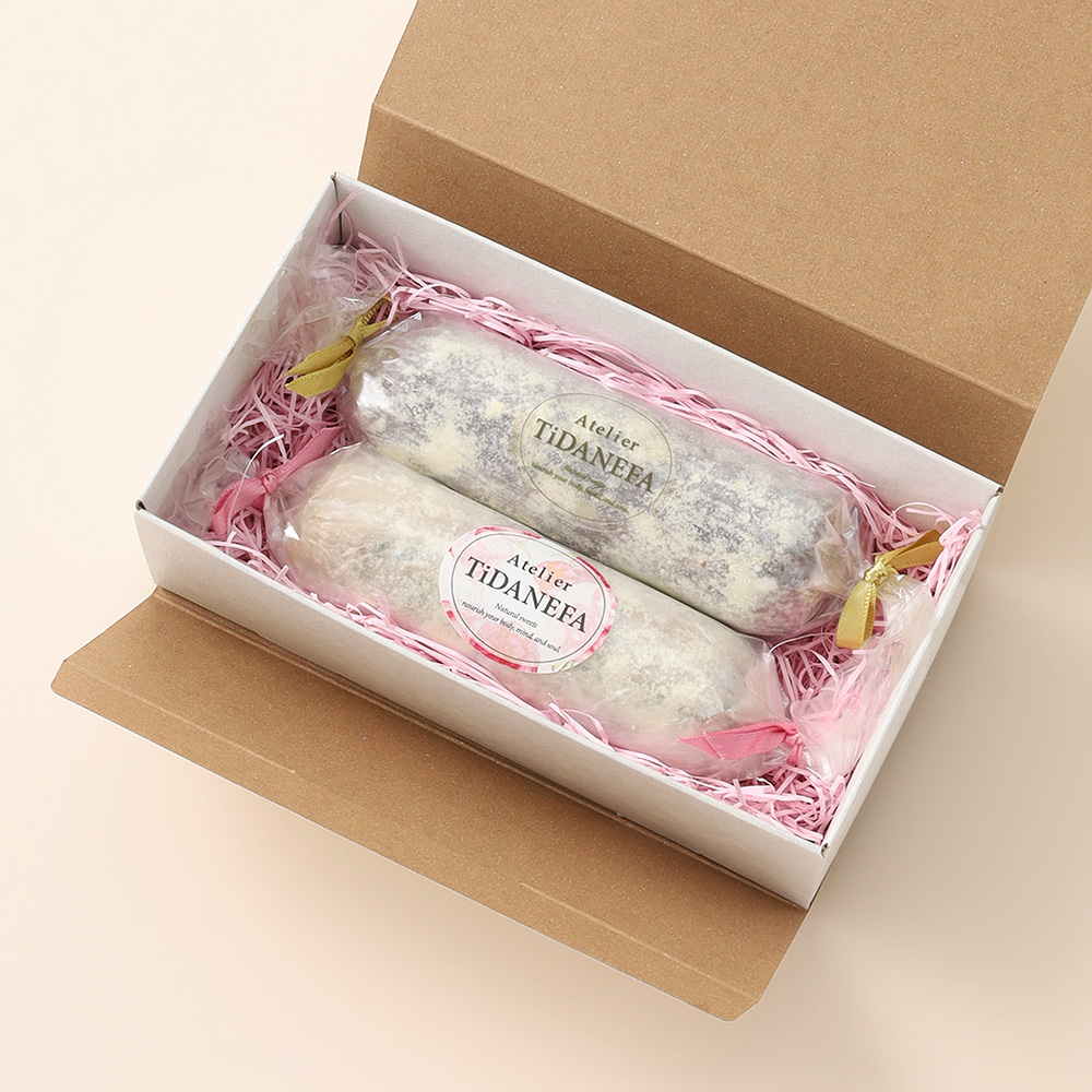 フランスで親しまれてきた「ソシソン・ショコラ」。サラミのような姿のなかに、ナッツやドライフルーツを散りばめた、遊び心のあるチョコレート菓子です。Atelier TiDANEFAでは、この家庭菓子を植物の素材で丁寧に仕立て直し、ギフトにふさわしい洗練された味わいに仕上げました。ヴィーガン&グルテンフリーでありながら、素材の香りと食感を最大限に生かしています。<ソシソン・ショコラ・ノワール>は、エクアドル産アリバ種カカオマスの濃厚なヴィーガン生チョコに、自家製クッキー、ピーカンナッツ、自家製マジパン、カランツ、ピスタチオ、ピンクペッパーを合わせました。ラムが香り、ビターの奥に果実とスパイスの余韻が広がります。<ソシソン・ショコラ・ブラン>は、やさしい甘みのヴィーガンホワイトチョコをベースに、自家製ココアクッキー、オレンジピール、自家製レモンピール、クランベリー、ピスタチオを練り込み、キルシュで香りづけ。ほのかな酸味とミルキーな甘みが、軽やかな後味を描きます。断面には色とりどりの素材が顔をのぞかせ、まるで小さなモザイクのよう。スライスすれば、カカオと果実の香りが広がり、上質な余韻を残します。