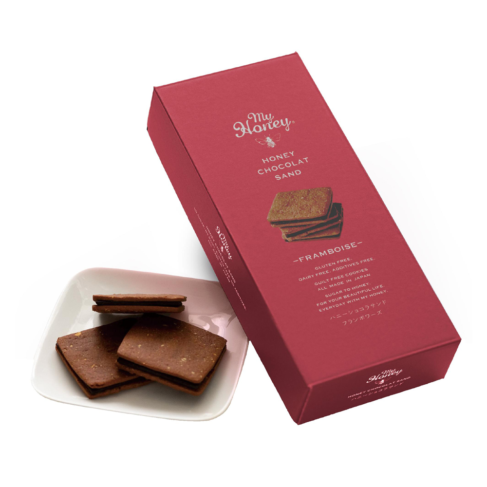 デイリーフリー(乳製品不使用)、たまごフリー、グルテンフリー(小麦粉不使用)のクッキーサンド。甘さは、はちみつだけ。1枚ずつ手作りで仕上げた罪悪感のないショコラサンドです。フランボワーズ(木苺)をカカオクリームに練りこんだ、MYHONEYのハニーショコラサンドフランボワーズは、フルーティーでほんのり甘酸っぱいのが特徴。その甘酸っぱさと、ほろ苦いカカオの相性が抜群です。噛みしめるごとにカカオとフランボワーズの魔法がお口の中で絶妙に広がります。
