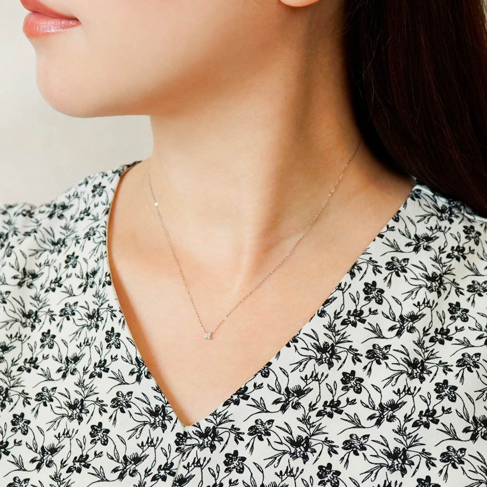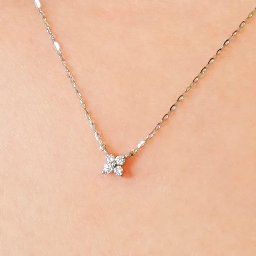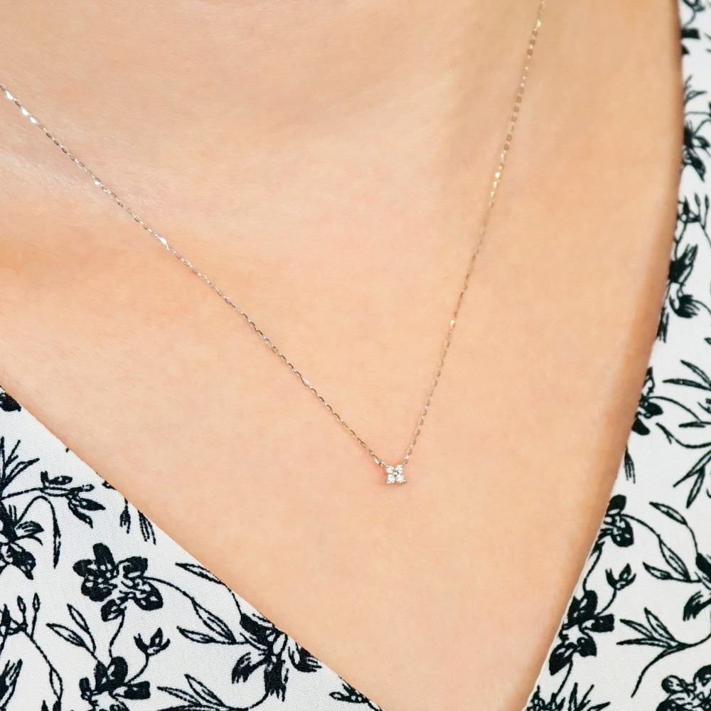 4石のダイヤモンドで花びらを繊細に表現しました。可愛らしく上品に、胸元で可憐な小花が輝きます。どんな装いにも着けられるベーシックなデザインでギフトにもおススメです。