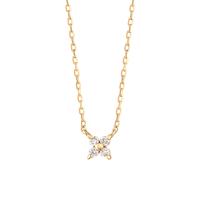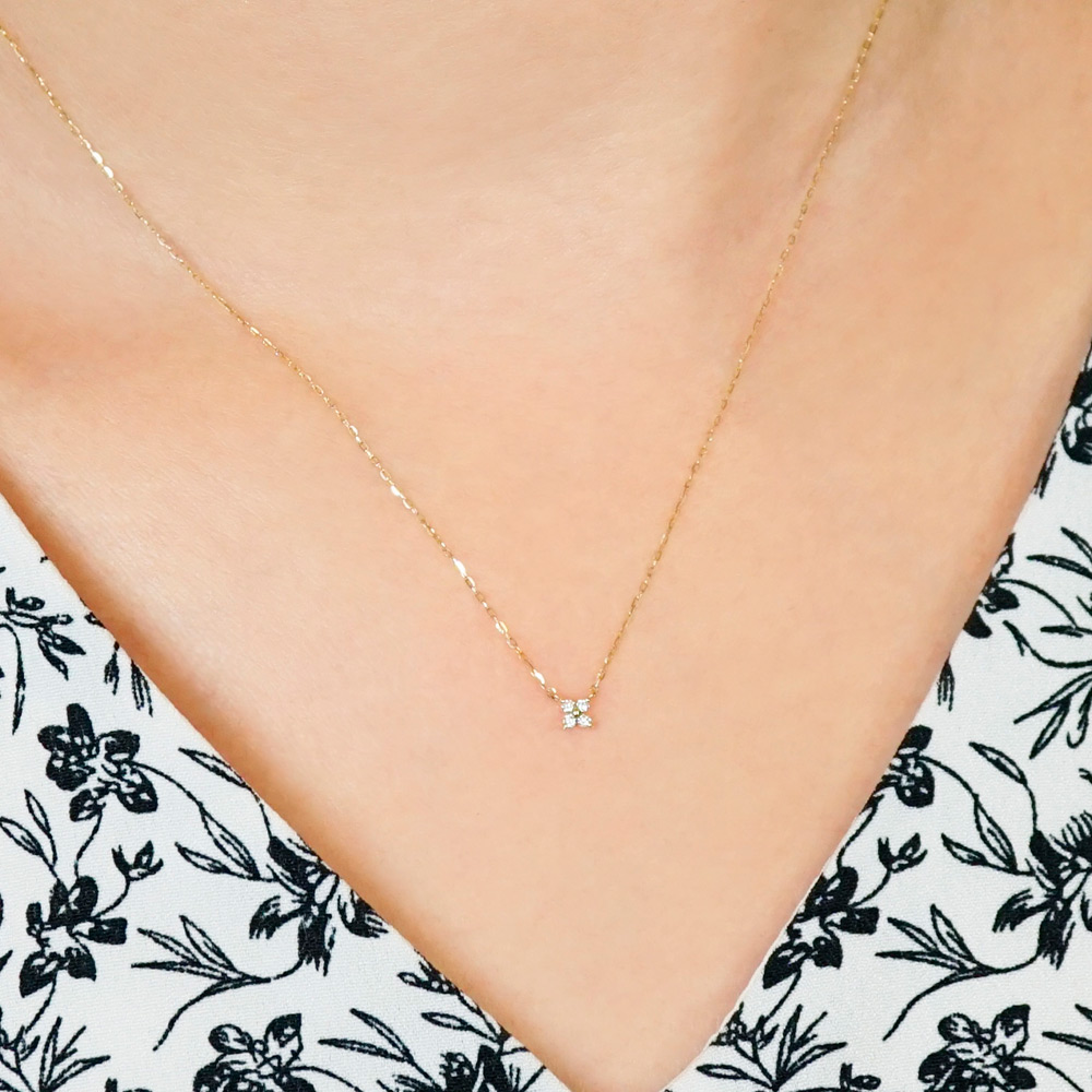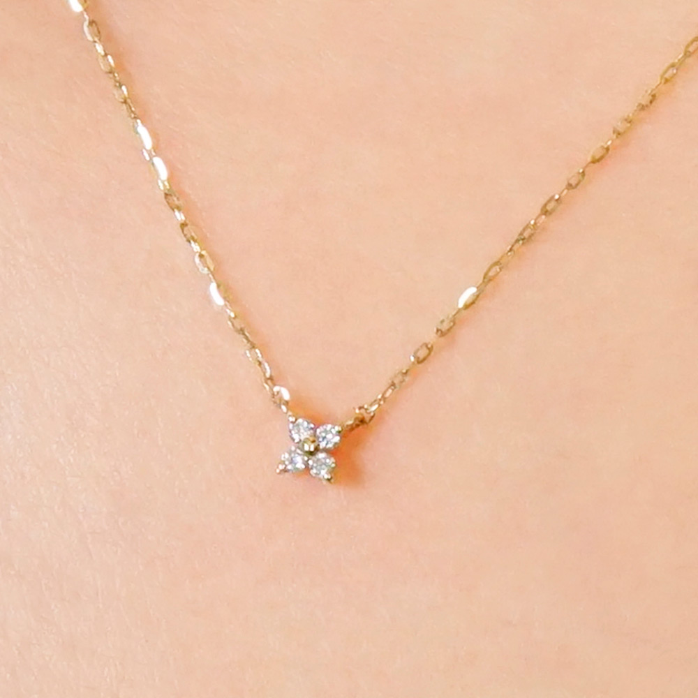 4石のダイヤモンドで花びらを繊細に表現しました。可愛らしく上品に、胸元で可憐な小花が輝きます。どんな装いにも着けられるベーシックなデザインでギフトにもおススメです。