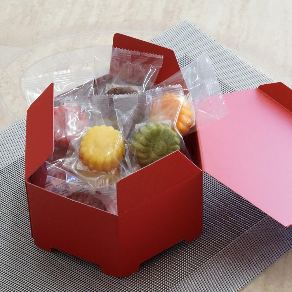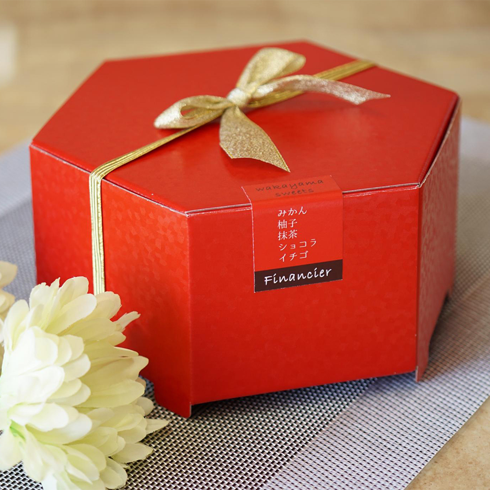 フィナンシェならではのアーモンドの香りと焦がしバターの風味。風味豊かなしっとりとした食感をお楽しみいただけます。真っ赤な六角形の箱で華やかさも増します。