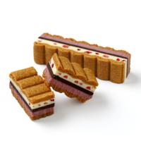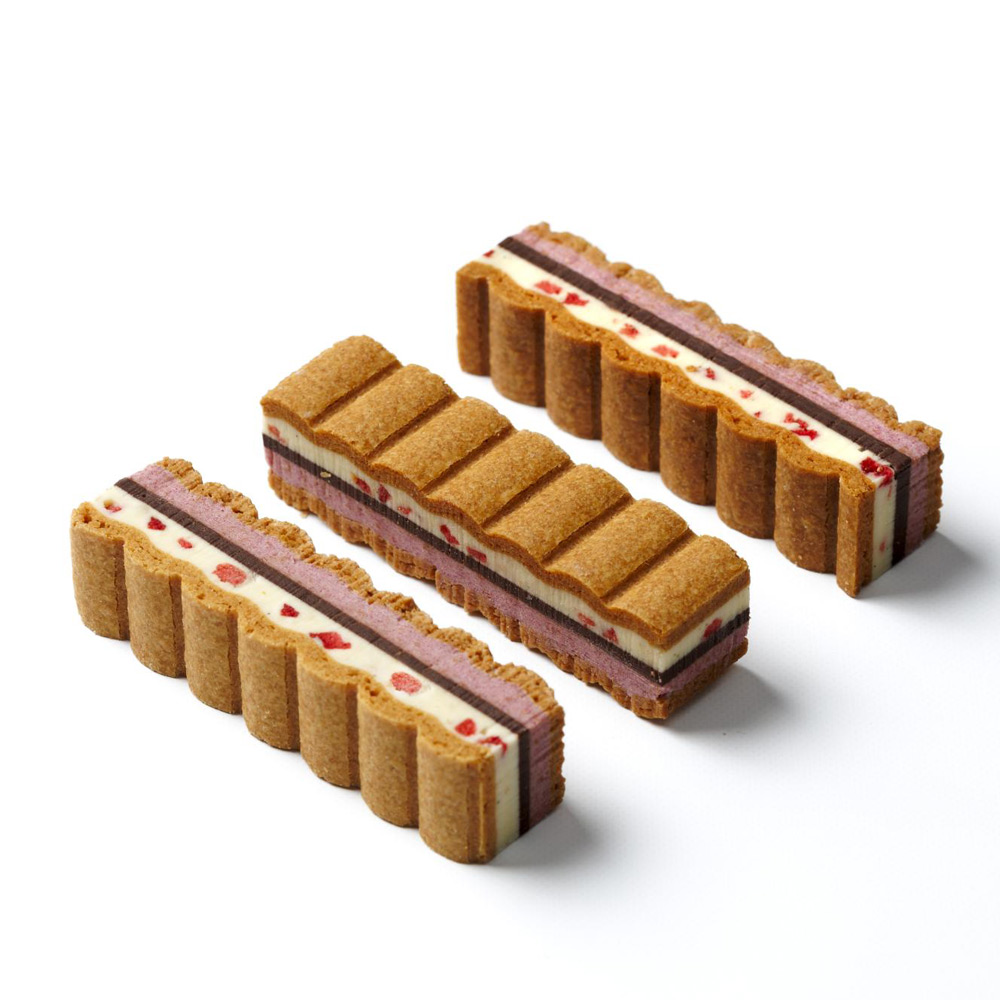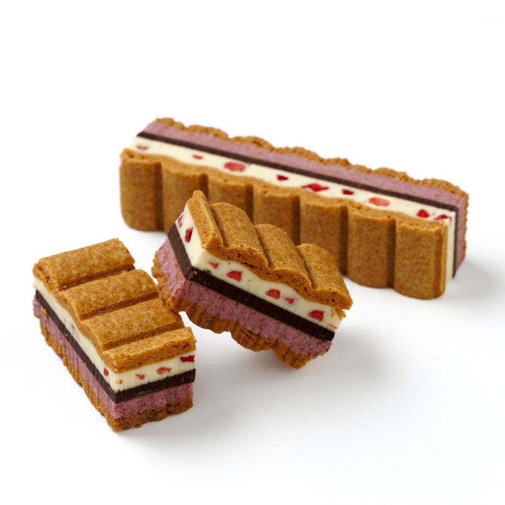可愛らしいピンク色が目を引くフレーバーは、甘酸っぱいストロベリークリームとフリーズドライの苺を散りばめた香り高いローズクリーム、こだわりのビーントゥバーチョコレートをサクサクのバニラサブレでサンドしました。