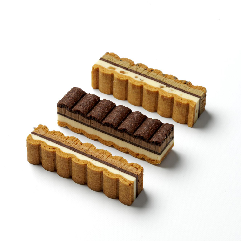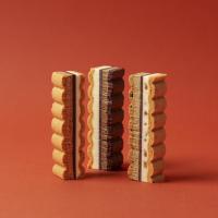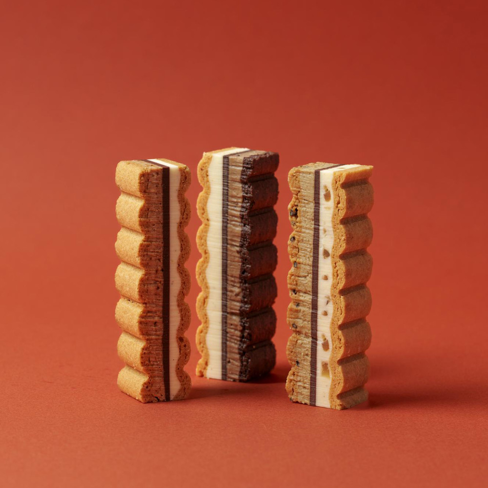RAUの人気商品「Nami-Nami」の季節限定の3種アソート。サクサク食感の波型サブレに、滑らかな2種のクリームとビーントゥバーの板チョコレートをは挟んだクリームサンドサブレです。新フレーバーの「カフェオレ」と季節限定フレーバー「マロン」、定番フレーバー「プラリネ」の3本セットです。