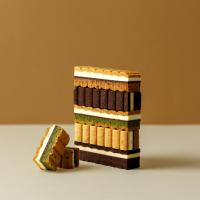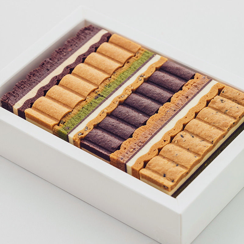 プレーン・ショコラ・ゴマの波型サブレに、それぞれ2種の軽やかなクリームと濃厚な板チョコレートを挟んだ、サクサク食感の楽しいクリームサンドサブレ。RAUのシェフパティシエールがフランスと京都の街で見た、屋根瓦の風景や形状をイメージして生まれました。お子様からご年配の方まで、幅広い世代の方に喜ばれる親しみやすい味わいです。プラリネ・ショコラ・抹茶の3種を詰め合わせた3本セット。