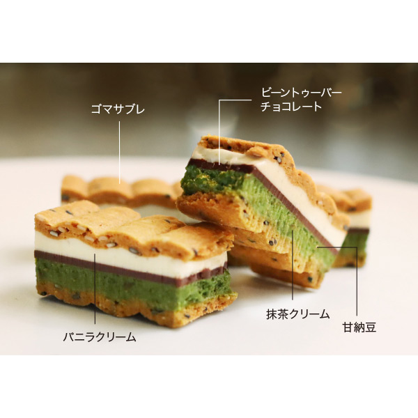 フランスでは瓦を意味する「チュイール」というお菓子が昔からあり、日本では「瓦せんべい」というお菓子が昔から親しまれています。同じモチーフでも文化背景が異なると違った味・形になること。どちらも普遍的なものとして歴史の中に受け継がれているということ。そこからヒントを得たRAUのシェフが、フランスと京都の街で見た瓦屋根の風景の記憶を融合させ、日本人が表現する新しいチュイールとして生まれたのが「Nami-Nami」です。・プラリネ:キャラメリゼしたヘーゼルナッツ香ばしさと食感にこだわった自家製プラリネクリームがアクセントになり、甘さの中にキレのある味わい。・抹茶:風味豊かな黒ゴマと白ゴマをサブレに練りこみ、抹茶クリームには相性の良い甘納豆を散りばめた全体的に奥深い味わい。・ショコラ:コスタリカ産カカオ豆からつくるビーントゥバーチョコレートのビタークリームをサンド。アクセントにカリっとした食感のローストカカオの粒が入ることで、カカオ本来の美味しさが引き立つちょっぴり大人な味わい。