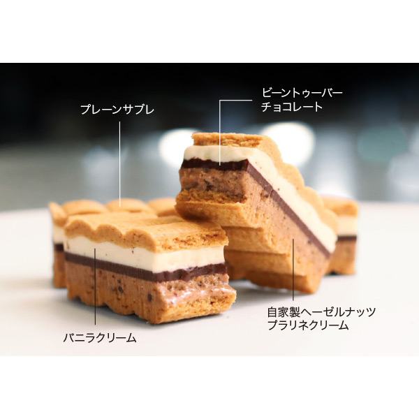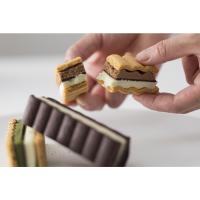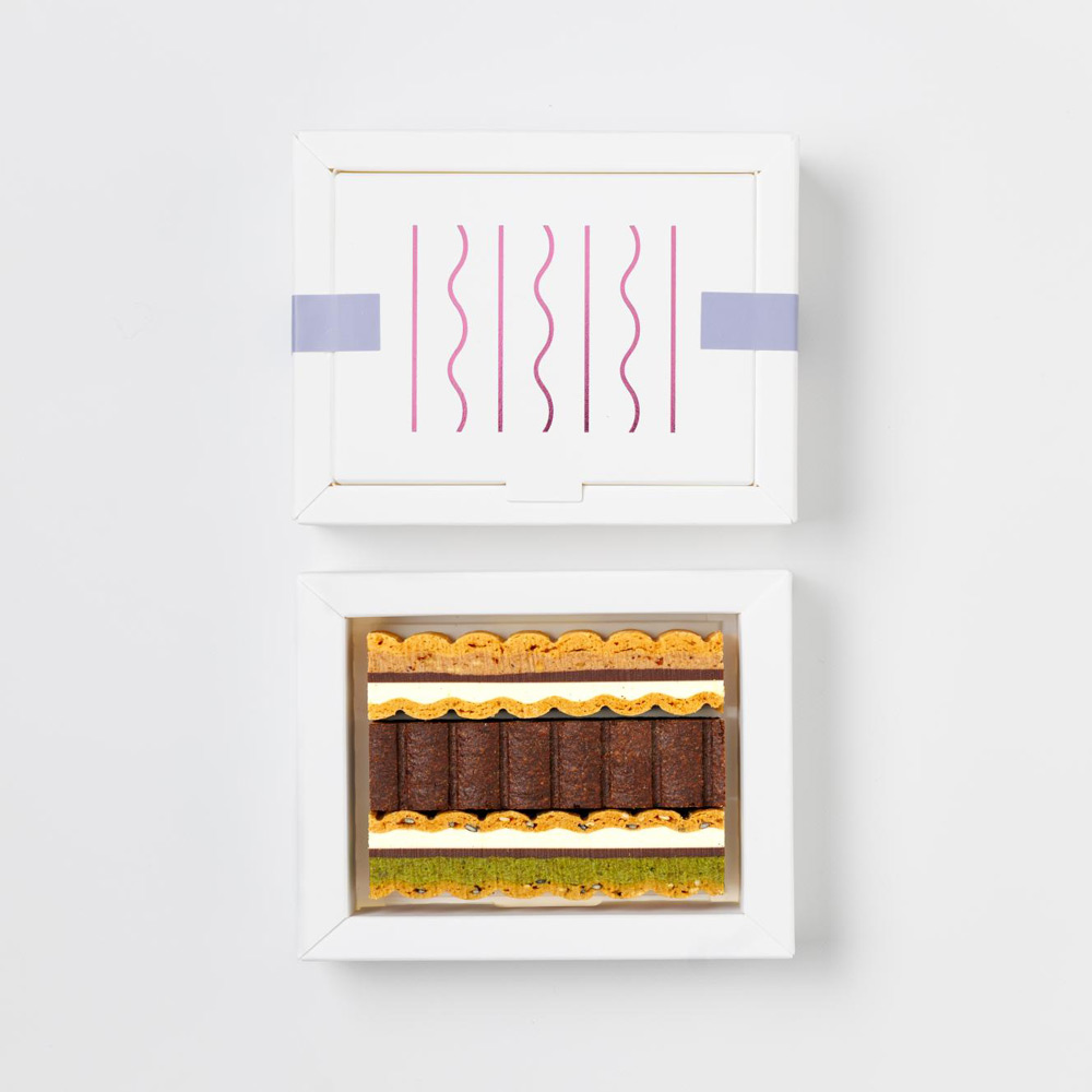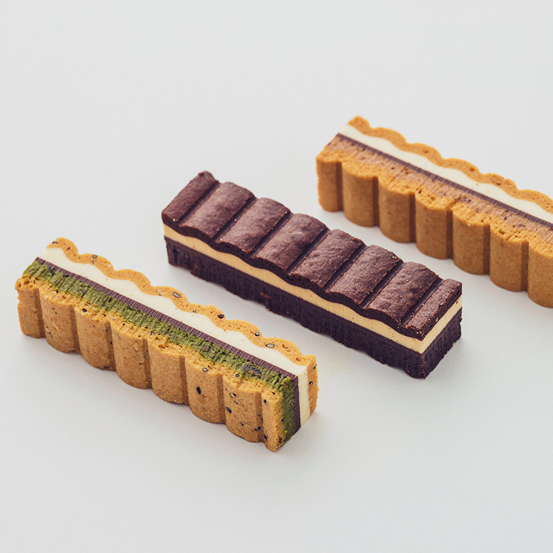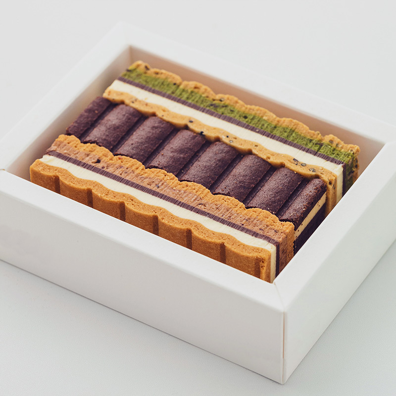 プレーン・ショコラ・ゴマの波型サブレに、それぞれ2種の軽やかなクリームと濃厚な板チョコレートを挟んだ、サクサク食感の楽しいクリームサンドサブレ。RAUのシェフパティシエールがフランスと京都の街で見た、屋根瓦の風景や形状をイメージして生まれました。お子様からご年配の方まで、幅広い世代の方に喜ばれる親しみやすい味わいです。プラリネ・ショコラ・抹茶の3種を詰め合わせた3本セット。
