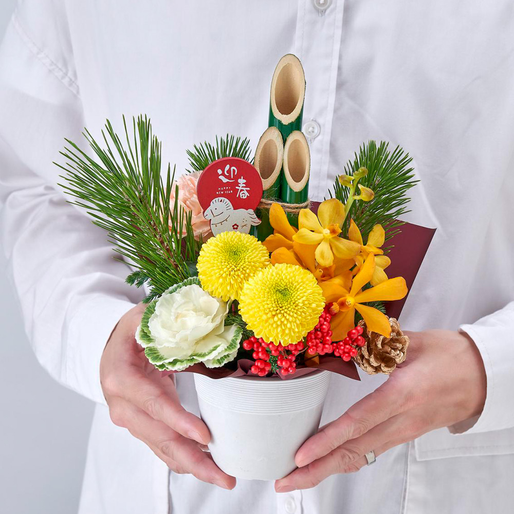 古くより日本では、新年を迎える際に縁起を担ぎ、生命力あふれる植物を飾る風習があります。この迎春アレンジメントは、<日比谷花壇>のデザイナー、西澤真実子氏が手掛けた特別な一品。西澤氏特有の、花の繊細な色合いを活かした女性的で透明感のあるデザインが魅力で、新しい年の始まりにふさわしい清らかで優美な空間を演出します。和の伝統的な素材にモダンな感性を加え、和室にも洋室にも飾るだけで気軽に取り入れられるのが特長です。そして、このセットには、伝統の味を守り続ける<とらや>の「小形羊羹5本入 干支柄化粧箱」を添えました。熟練の職人が丁寧に作り上げた上品な甘さと風味を、その年の干支をあしらった華やかな化粧箱でお届けします。日比谷花壇が誇る美と、老舗の格式ある味わいを一緒に贈る、特別な迎春ギフトです。大切な方への新年のご挨拶や、ご自宅の寿ぎの準備に、清々しく、華やかな新年をお迎えください。