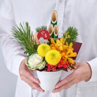 アーティフィシャルフラワー(実)、マツカサ、水引、門松、樹脂製花器(一部にリサイクル素材配合)、お手入れのしおり付