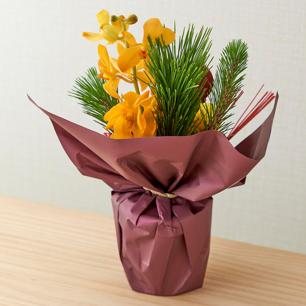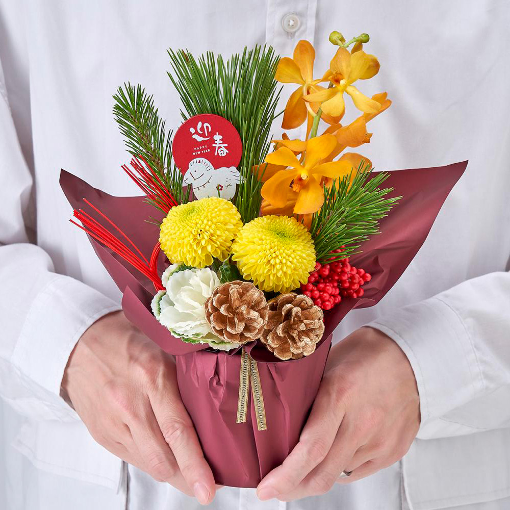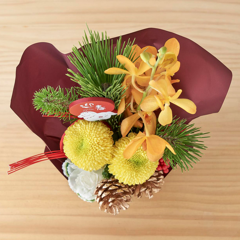 メインとなる迎春シュシュは、<日比谷花壇>のデザイナー、西澤真実子氏が手掛けた特別な一品。西澤氏特有の、花の繊細な色合いを活かした女性的で透明感のあるデザインが魅力です。和の伝統的な素材にモダンな感性を加え、和室にも洋室にも飾れるのが特長です。また、お手入れ簡単なスタンディングタイプなので、アレンジメントのようにそのまま飾れて手軽に楽しんでいただけます。セットには、伝統の味を守り続ける<とらや>の「小形羊羹5本入 干支柄化粧箱」を添えました。熟練の職人が丁寧に作り上げた上品な甘さと風味を、その年の干支をあしらった華やかな化粧箱でお届けします。大切な方への新年のご挨拶や、ご自宅の寿ぎの準備にぜひご利用ください。