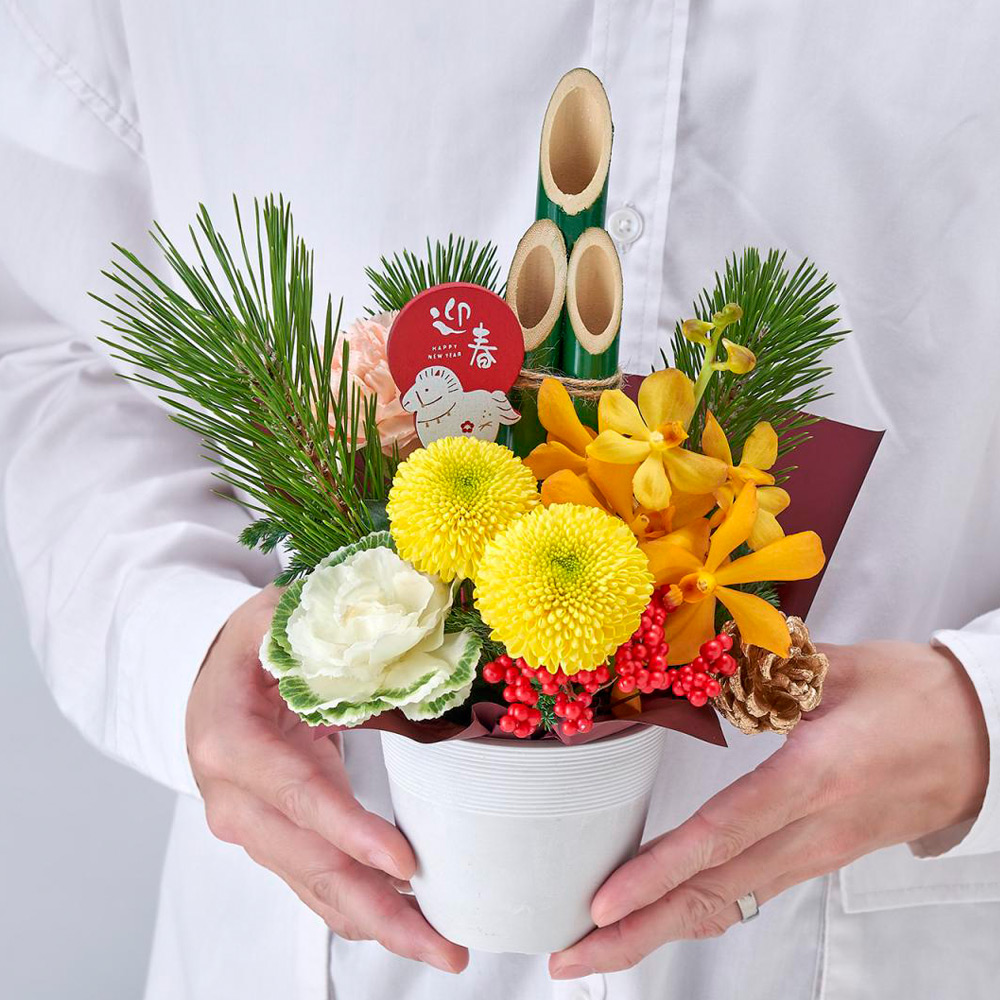 古くより日本では、新年を迎える際に縁起を担ぎ、生命力あふれる植物を飾る風習がありました。門松が歳神様を迎える目印とされるように、迎春のアレンジメントには、一年の多幸を願う心が込められています。この生花アレンジメントは、長きにわたりフラワーギフト製作に携わる<日比谷花壇>のデザイナー、西澤真実子氏が手掛けた特別な商品です。西澤氏特有の、花の繊細な色合いを活かした女性的で透明感のあるデザインは、新しい年の始まりにふさわしい清らかで優美な空間を演出します。和の伝統的な素材に、モダンな感性を加えたデザインは、和室にも洋室にも飾るだけで気軽に取り入れられるのが魅力です。迎春の準備として、ご自宅用はもちろん、大切な方への新年のご挨拶を込めた贈りものとしてもおすすめです。日比谷花壇が誇る美で、清々しく、華やかな新年をお迎えください。
