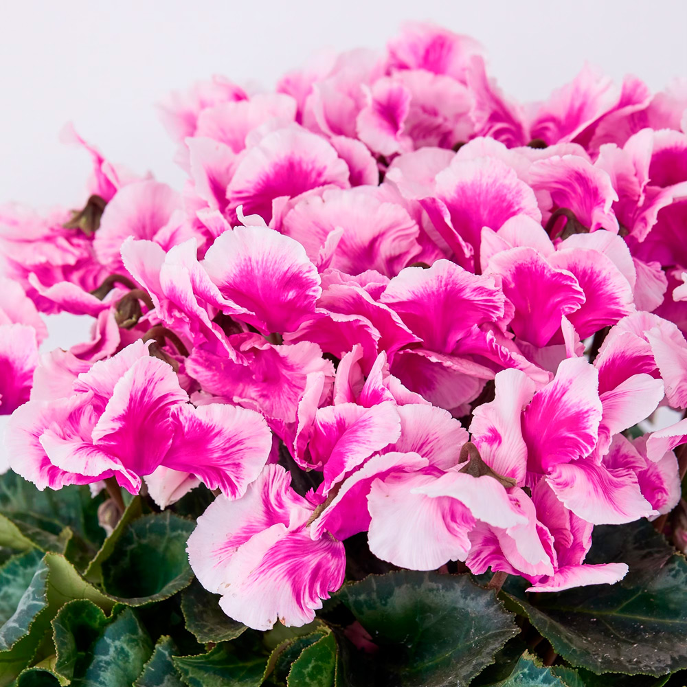 冬を彩るシクラメンの生花の鉢。強いウェーブがかかった紫と白の混合で株も大きく立派です。花弁と葉っぱのコントラストが美しく、葉数もあり株がしっかりしているので、見た目も豪華です。春まで次々と元気な花が咲き続ける美しい花姿をお楽しみください。